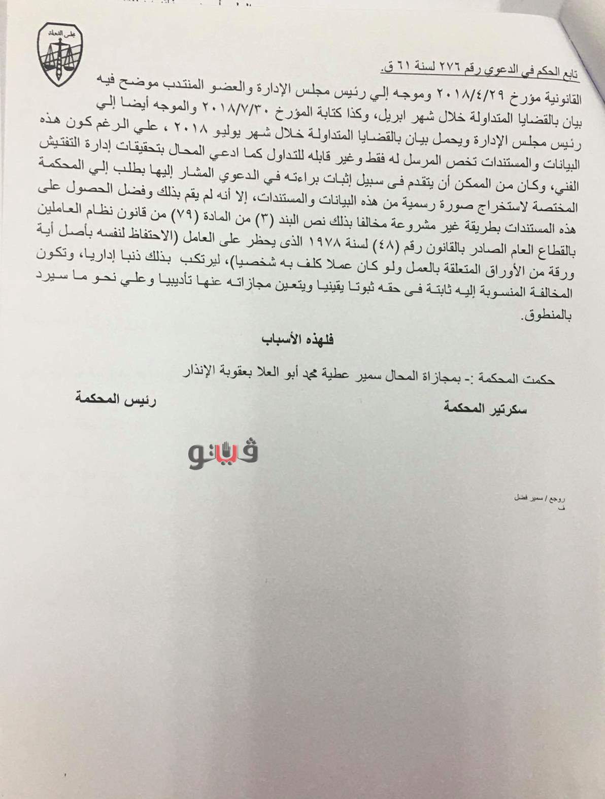وأكدت المحكمة عبر أسباب حكمها صحة ما كشفت عنه تحقيقات إدارة التفتيش على الإدارات القانونية بوزارة العدل بأن سمير عطية محمد، مدير عام القضايا بالإدارة القانونية بشركة النصر للإسكان والتعمير إحتفظ لنفسه بأصل أوراق متعلقة بالعمل، تتمثل في أصل بيان القضايا المتداولة من شهري إبريل ويوليو 2018 وقدمها للمحكمة التأديبية في الدعوى رقم 55 لسنة 61 قضائية.