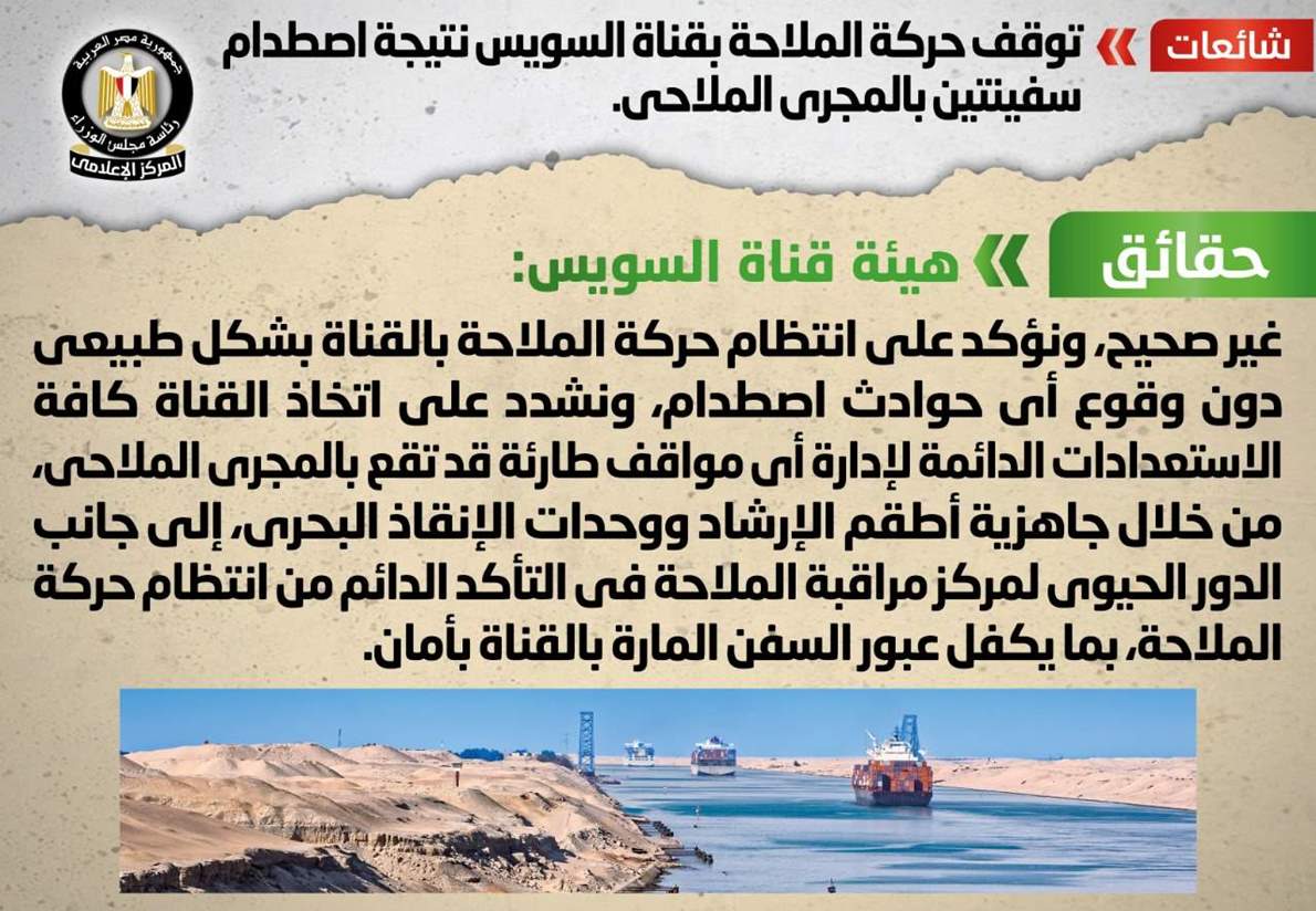 وتواصل المركز الإعلامي لمجلس الوزراء مع هيئة قناة السويس، والتي نفت تلك الأنباء، مُؤكدةً أنه لا صحة لتوقف حركة الملاحة بقناة السويس نتيجة اصطدام سفينتين بالمجرى الملاحي.