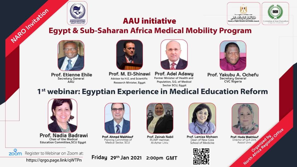 وتنطلق اليوم، فعاليات الويبينار الأول من سلسلة اللقاءات الافتراضية بين خبراء التعليم الطبي، لعرض التجربة المصرية في تطوير التعليم الطبي كتجربة رائدة، عبر زوم وسيتم البث المباشر من صفحة المقر الإقليمي لاتحاد الجامعات الإفريقية لشمال إفريقيا ومنسق المبادرة، والذي تستضيفه جامعة الأزهر، في إطار الريادة المصرية.