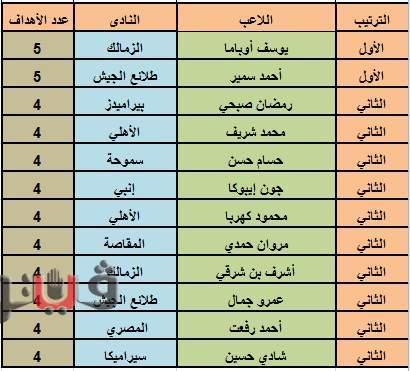 ونجح يوسف أوباما مهاجم الزمالك في انتزاع صدارة الدوري بتسجيله هدفين في مباراة فريقه أمام مصر المقاصة أمس الخميس، ليرفع رصيده إلى 5 أهداف، ليرتقي لصدارة هدافي الدوري لأول مرة هذا الموسم.