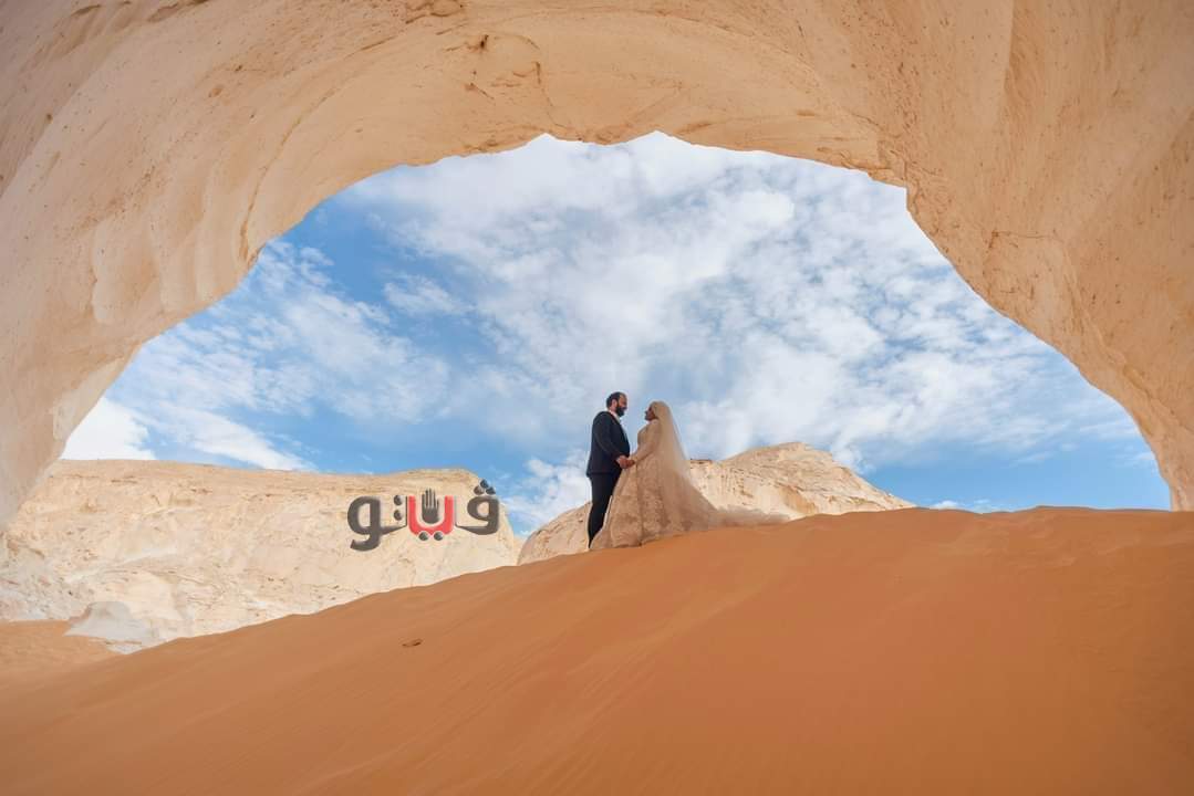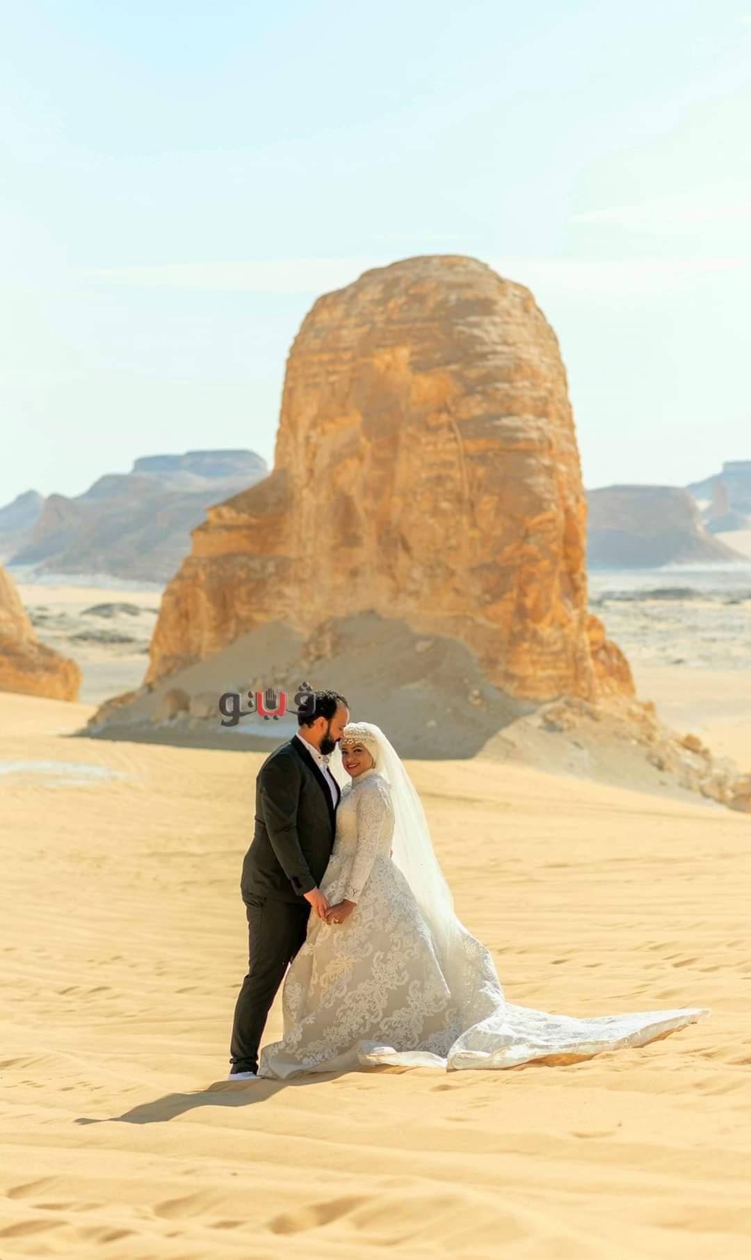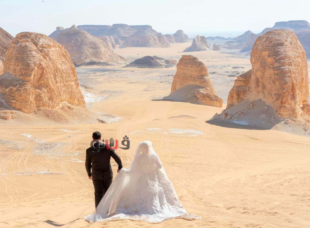 "فوتوسيشن الصحرا".. عروسان يحتفلان بزفافهما في الصحراء الغربية