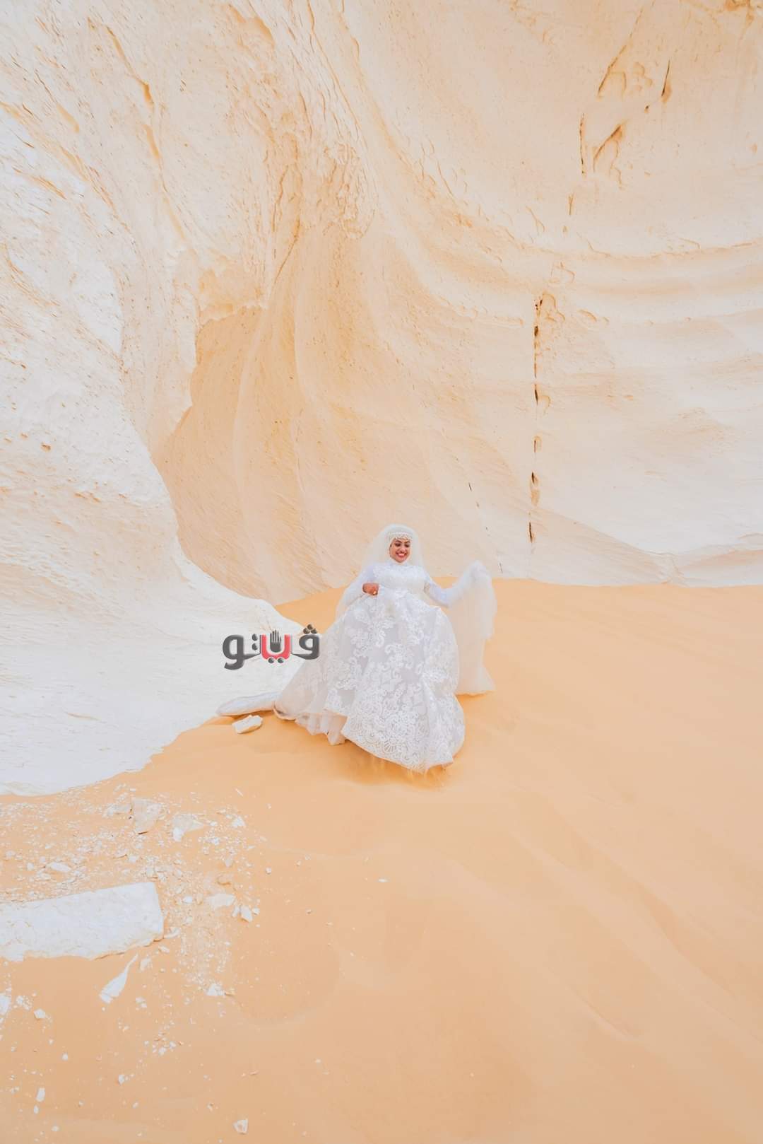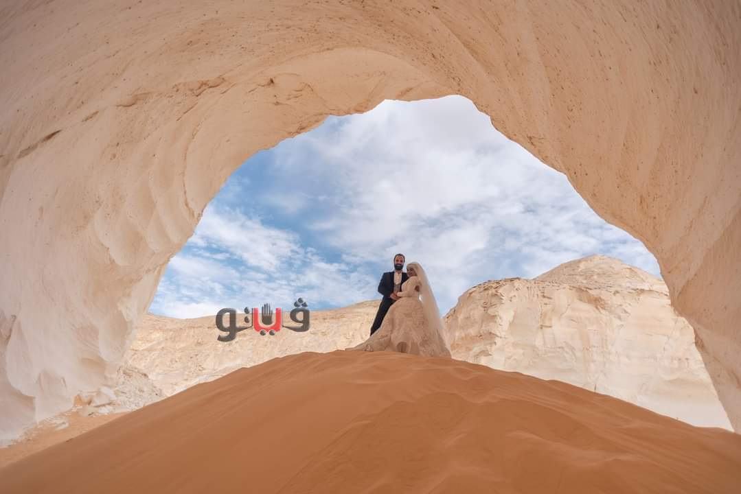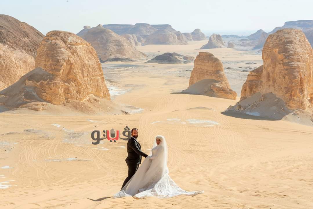 قرر عروسان التقاط صور الزفاف الخاصة بهما بطريقة غير تقليدية بالصحراء البيضاء بواحة الفرافرة بمحافظة الوادي الجديد والملقبة بواحة الثلج، قاطعين مئات الكيلومترات لالتقاط "فوتوسيشن" بهذه المنطقة الخلابة.