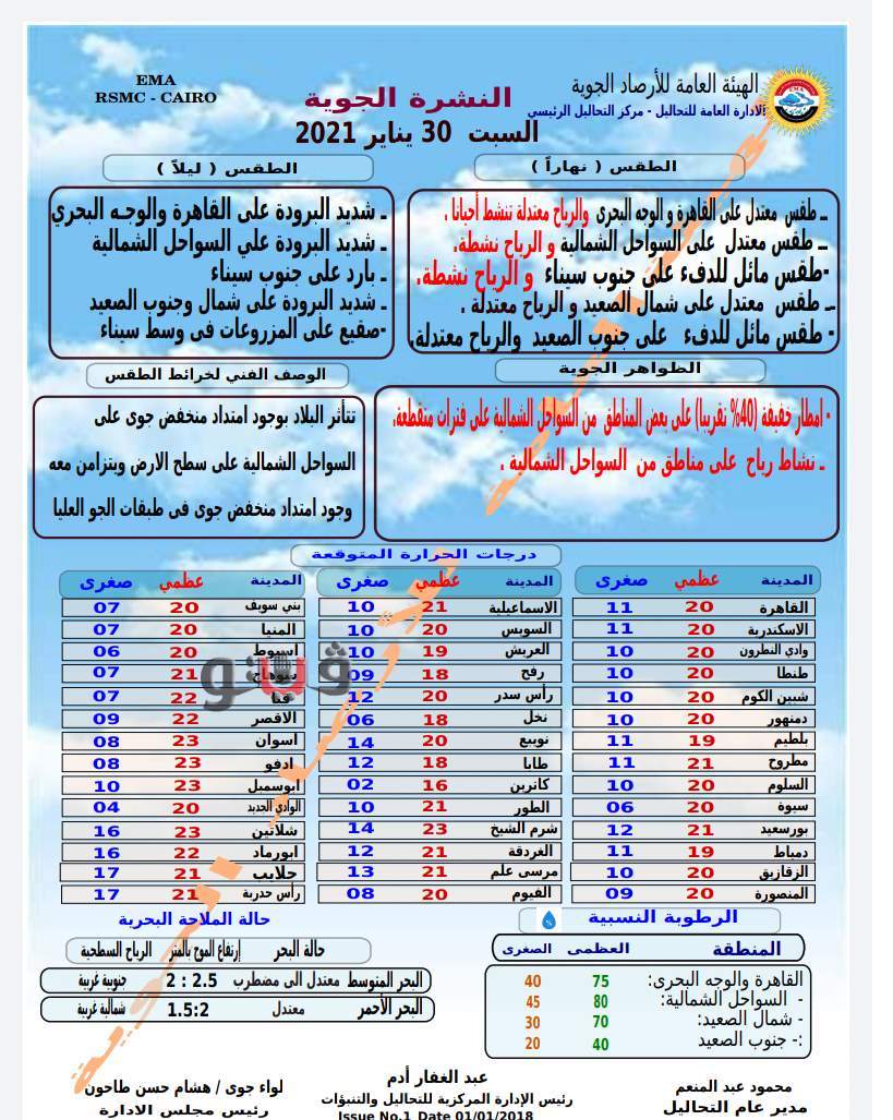 وتنخفض درجات الحرارة انخفاضا شديدا ملحوظا على شمال البلاد، ومن المتوقع سقوط أمطار خفيفة على السواحل الشمالية مع صقيع فى المزروعات ليلا بوسط سيناء.