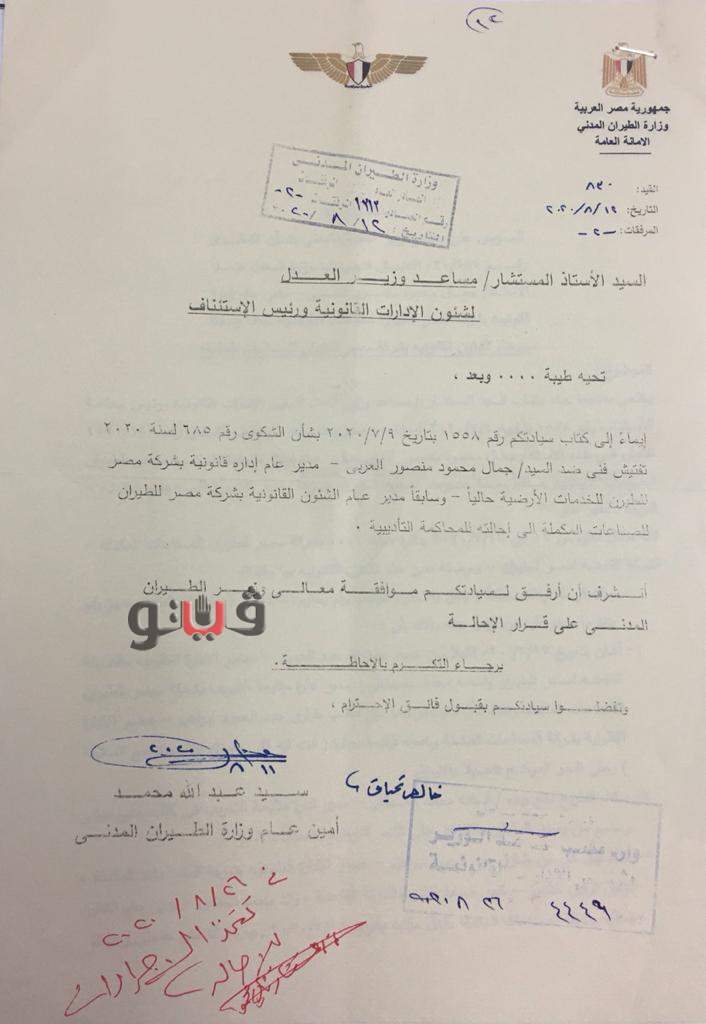 جاء ذلك في مذكرة أمين عام وزارة الطيران المدني للعرض على الوزير بشأن خطاب مساعد وزير العدل للإدارات القانونية بوزارة العدل رقم 1558 المؤرخ في 9 يوليو 2020، والمنتهي إلى طلب العرض على وزير الطيران المدني للإفادة بالرأي بشأن إحالة المذكور للمحاكمة