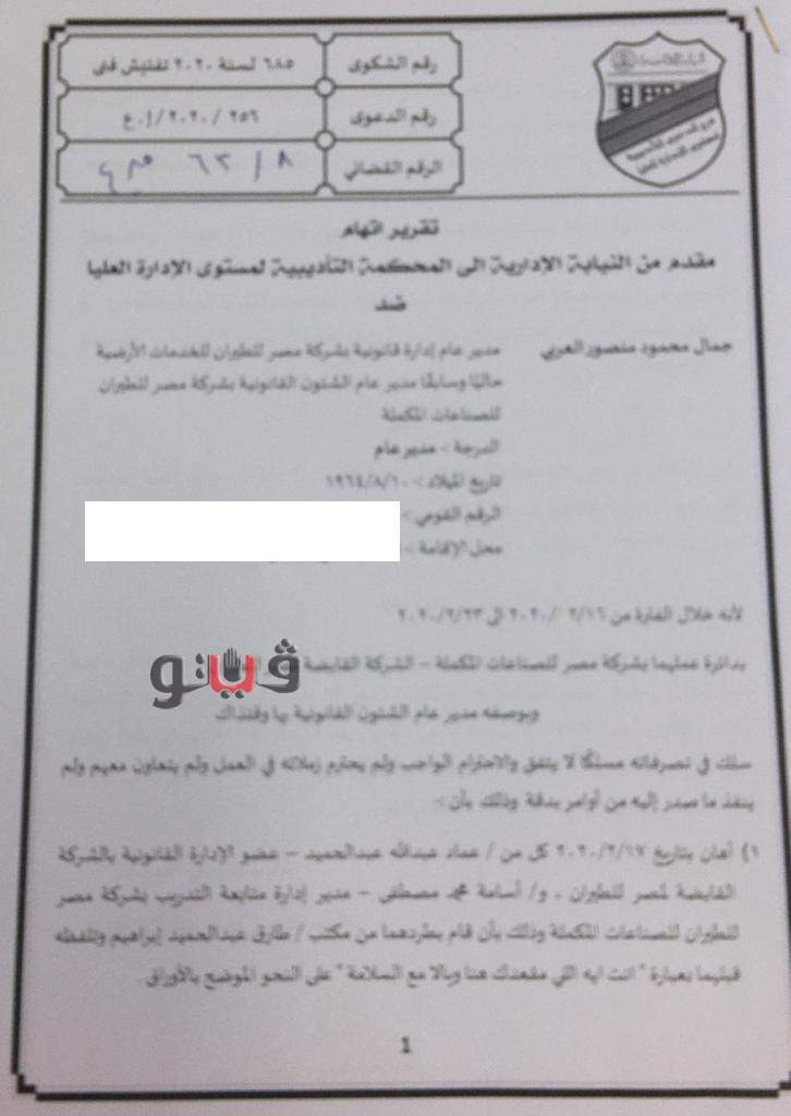 قررت وزارة العدل في القضية رقم 8 لسنة 63 قضائية عليا، إحالة مدير عام إدارة قانونية بشركة مصر للطيران للخدمات الأرضية "حاليًا" للمحاكمة بعد موافقة وزير الطيران المدني لثبوت ارتكابه مخالفات إدارية وقانونية.