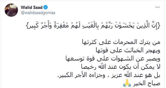 وكتب وليد سعد تغريدة على تويتر قال فيها: "{إِنَّ الَّذِينَ يَخْشَوْنَ رَبَّهُمْ بِالْغَيْبِ لَهُمْ مَغْفِرَةٌ وَأَجْرٌ كَبِير}.. من يترك المحرمات على كثرتها.. ويهجر الخبائث على قوتها.. ويصبر عن الشهوات على قوة توسعها.. لا يمكن أن يكون عند الله رخيصا.. بل هو عند الله عزيز ، وجزاءه الأجر الكبير".