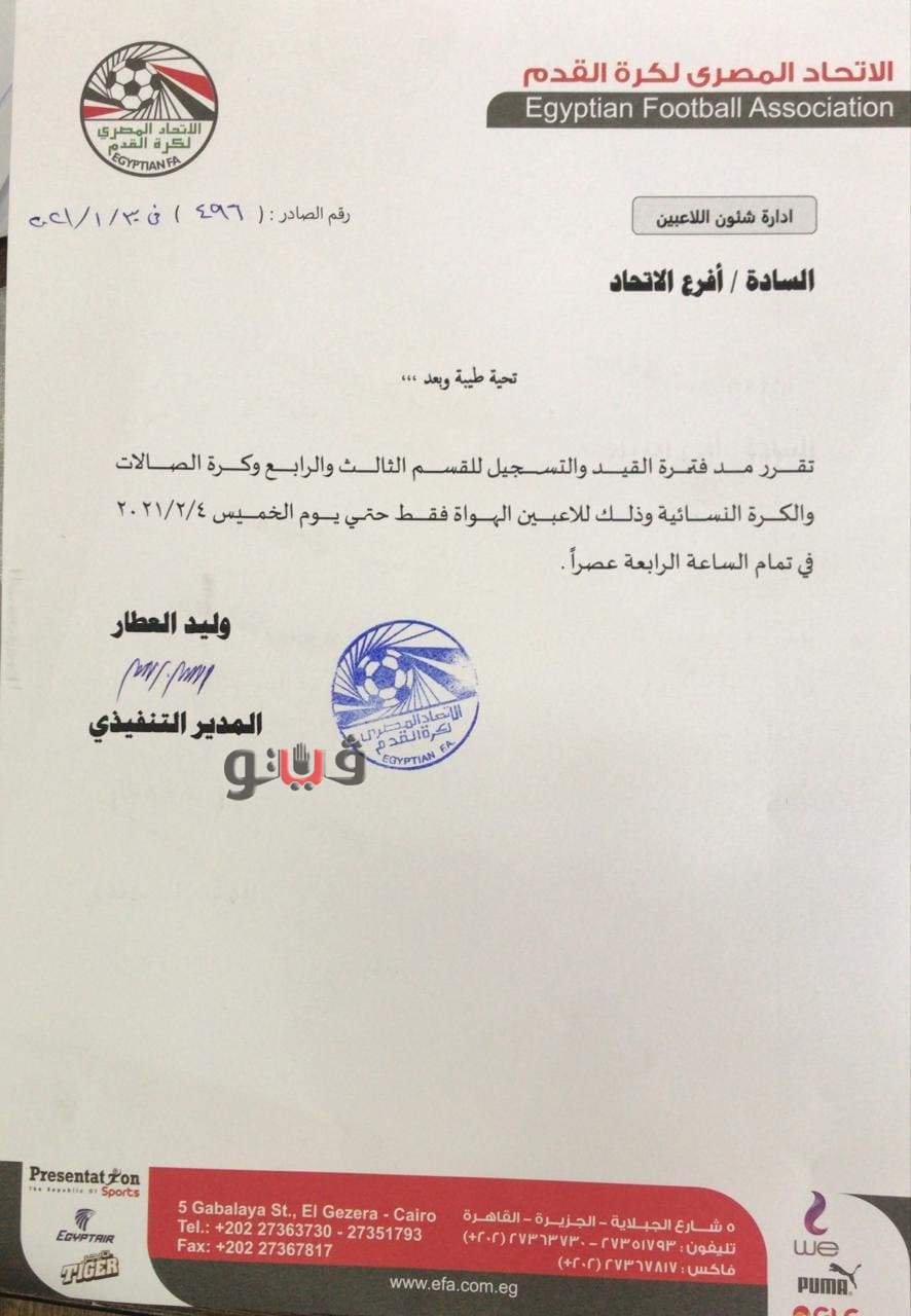 وأكد إتحاد الكرة في خطاب رسمي اليوم لأفرع المناق، مد القيد حتي يوم الخميس 4 فبراير المقبل في تمام الساعة الرابعة عصرا.
