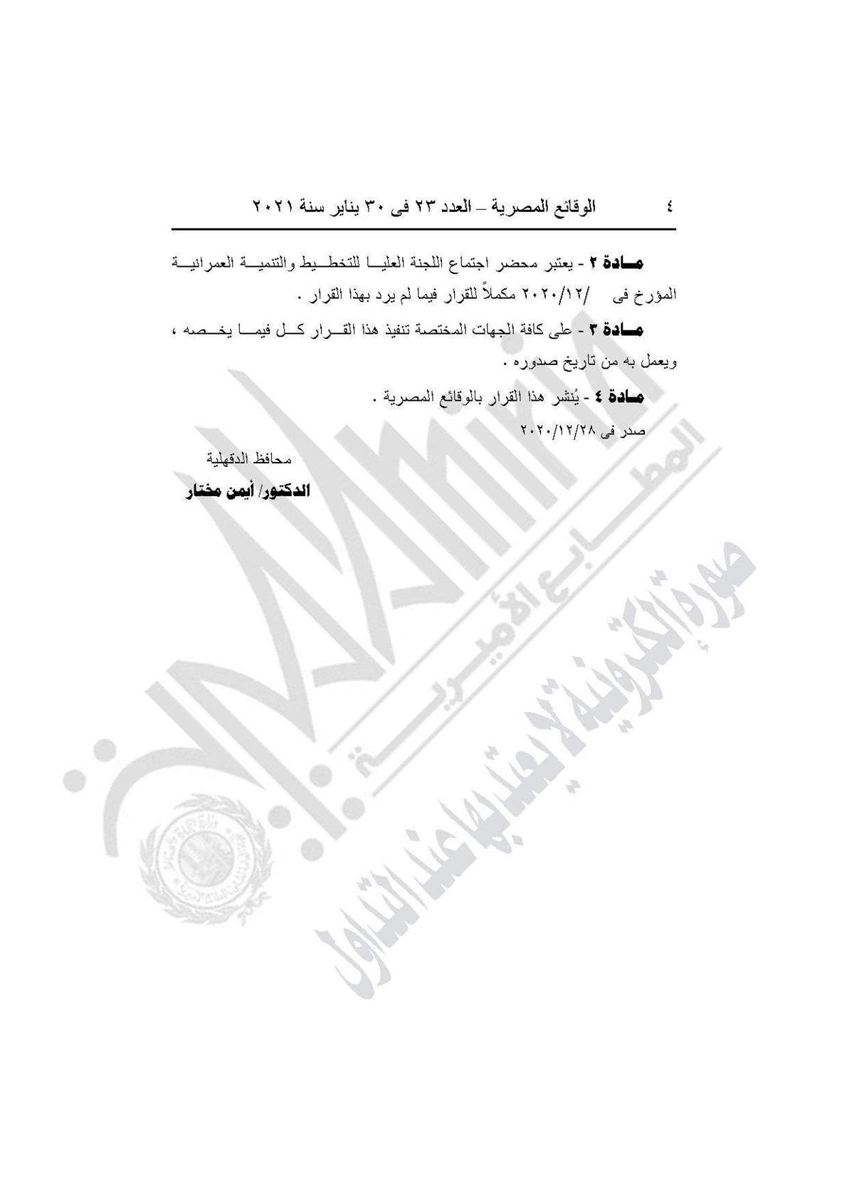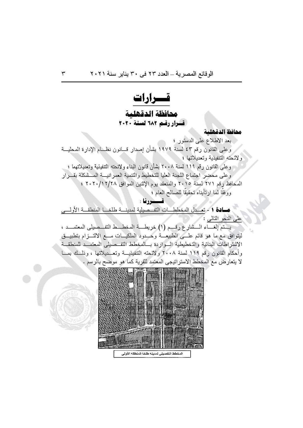 وينص القرار على تعديل المخططات التفصيلية لمدينة طلخا، بالمنطقة الأولى، على أن يتم إلغاء الشارع رقم (1) خريطة المخطط التفصيلي المعتمد.