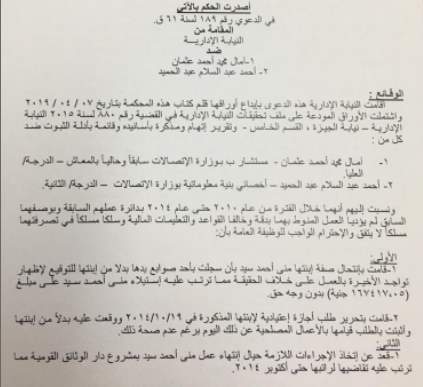 وأصدرت المحكمة حكمها بحضور المستشار فوزي عبد الهادي، ممثل النيابة الإدارية بمجازاة آمال محمد أحمد، مستشار (ب) بوزارة الاتصالات بغرامة تعادل 6 أضعاف الأجر الوظيفي الذي كانت تتقاضاه في الشهر عند انتهاء خدمتها، وخصم أجر 20 يومًا من راتب أحمد عبد السلام عبد الحميد.
