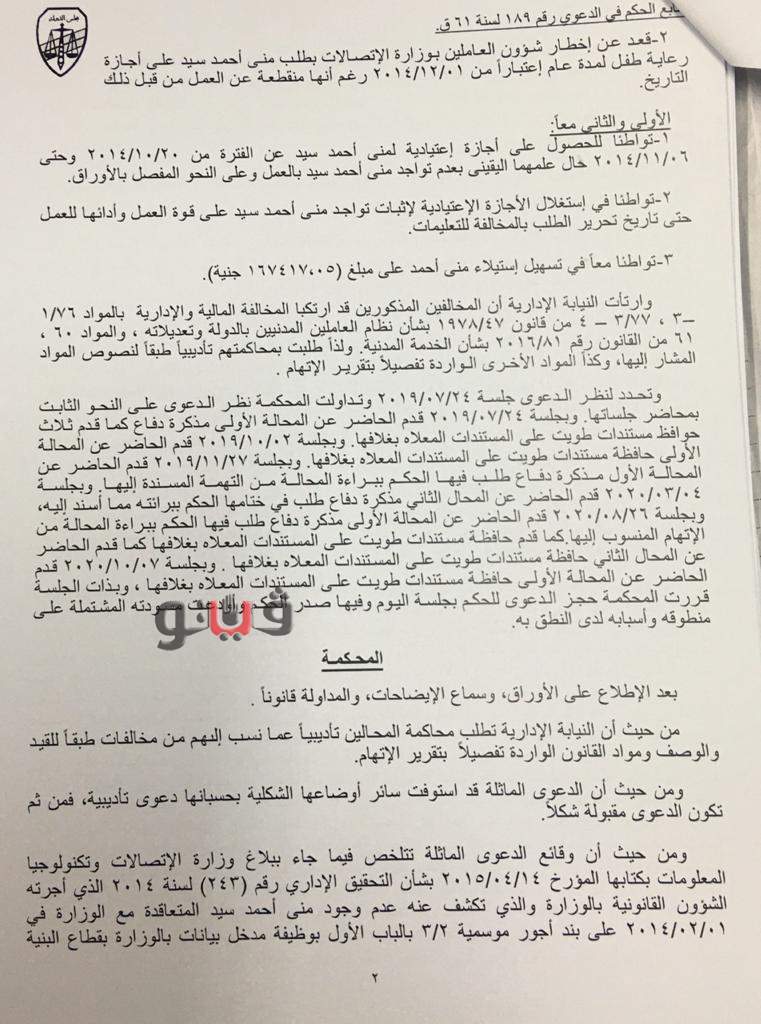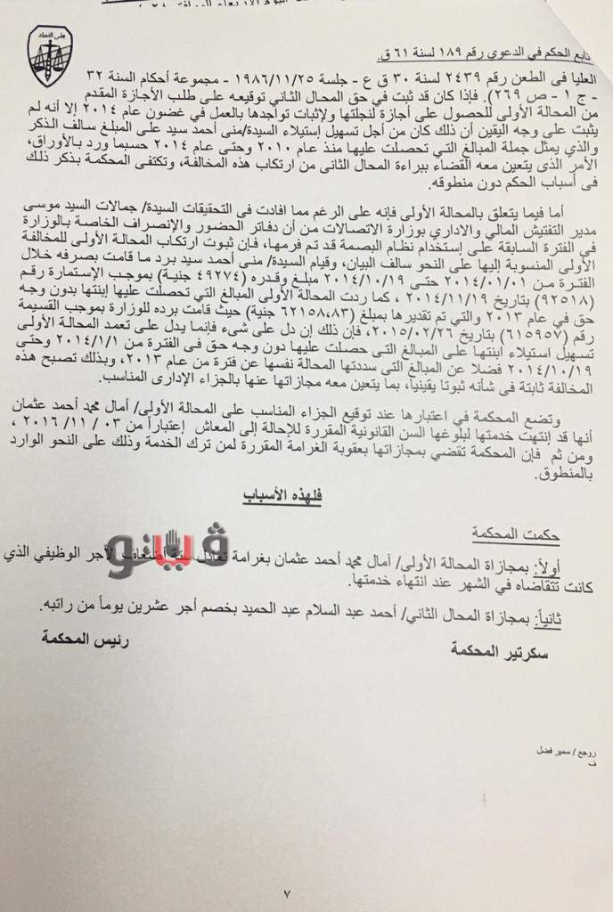 وتقاعس أحمد عبد السلام عبد الحميد، أخصائي بنية معلوماتية بالوزارة عن اتخاذ الإجراءات اللازمة حيال انتهاء عمل منى أحمد سيد بمشروع دار الوثائق القومية مما ترتب عليه تقاضيها راتبها لمدة 4 سنوات دون وجه حق، ولم يقم بإخطار شئون العاملين بالوزارة بطلب منى أحمد سيد للحصول على إجازة رعاية طفل لمدة عام رغم كونها منقطعة عن العمل قبل تقديم الطلب.