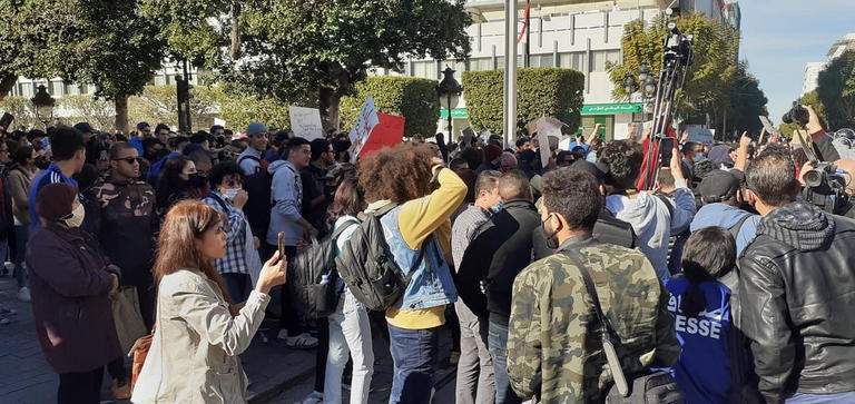 وتجمع المتظاهرون في شارع الحبيب بورقيبة الشهير بغية المطالبة بإطلاق سراح الموقوفين الذين اعتقلوا في الاحتجاجات الأخيرة، ورددوا شعارات تطالب بإسقاط النظام وحركة النهضة.