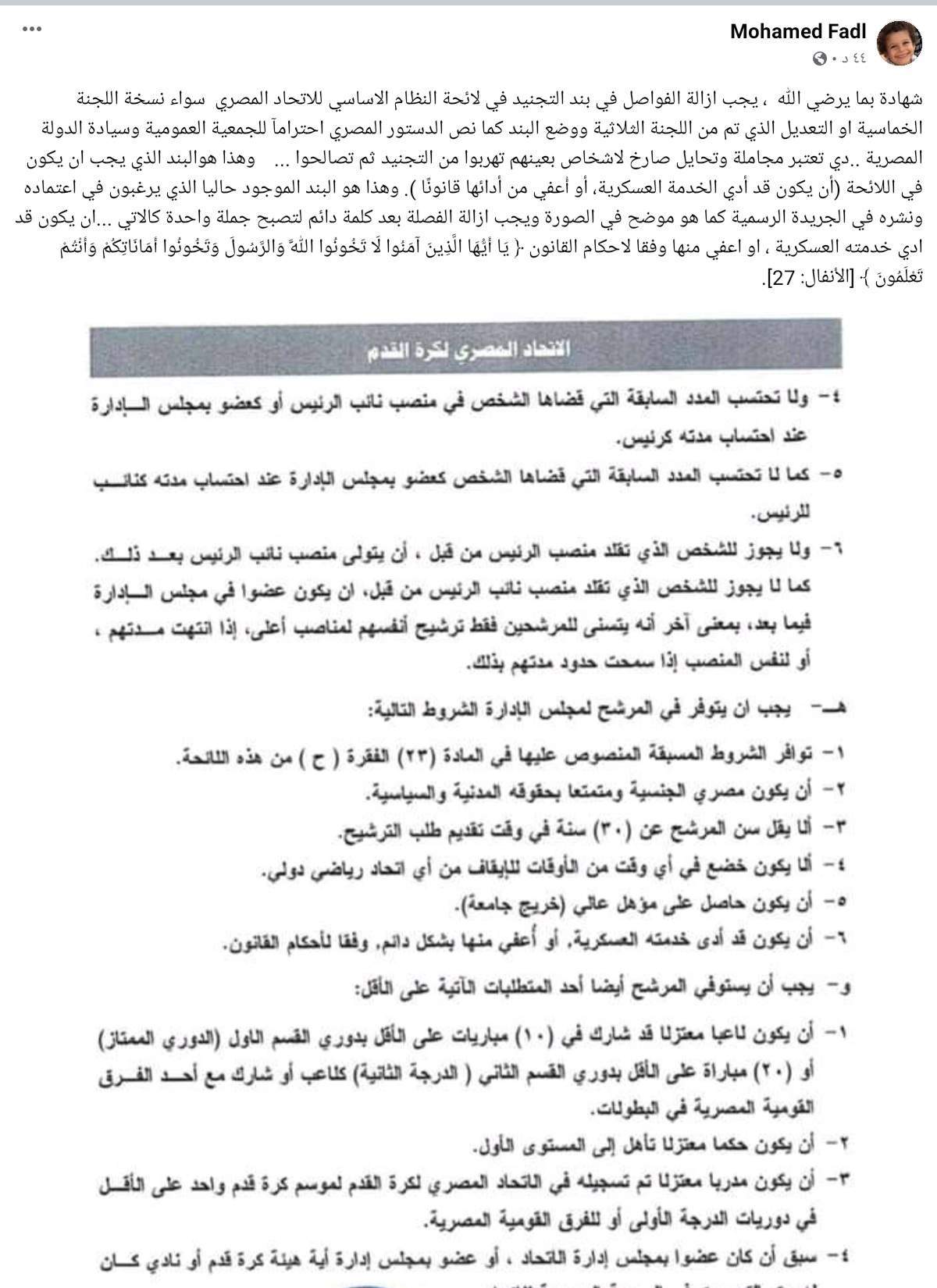 ونشر "فضل" عبر حسابه الشخصي بموقع التواصل الاجتماعى فيسبوك: "شهادة بما يرضي الله، يجب إزالة الفواصل في بند التجنيد في لائحة النظام الأساسي للاتحاد المصري سواء نسخة اللجنة الخماسية أو التعديل الذي تم من اللجنة الثلاثية، ووضع البند كما نص الدستور المصري احترامًا للجمعية العمومية وسيادة الدولة المصرية".