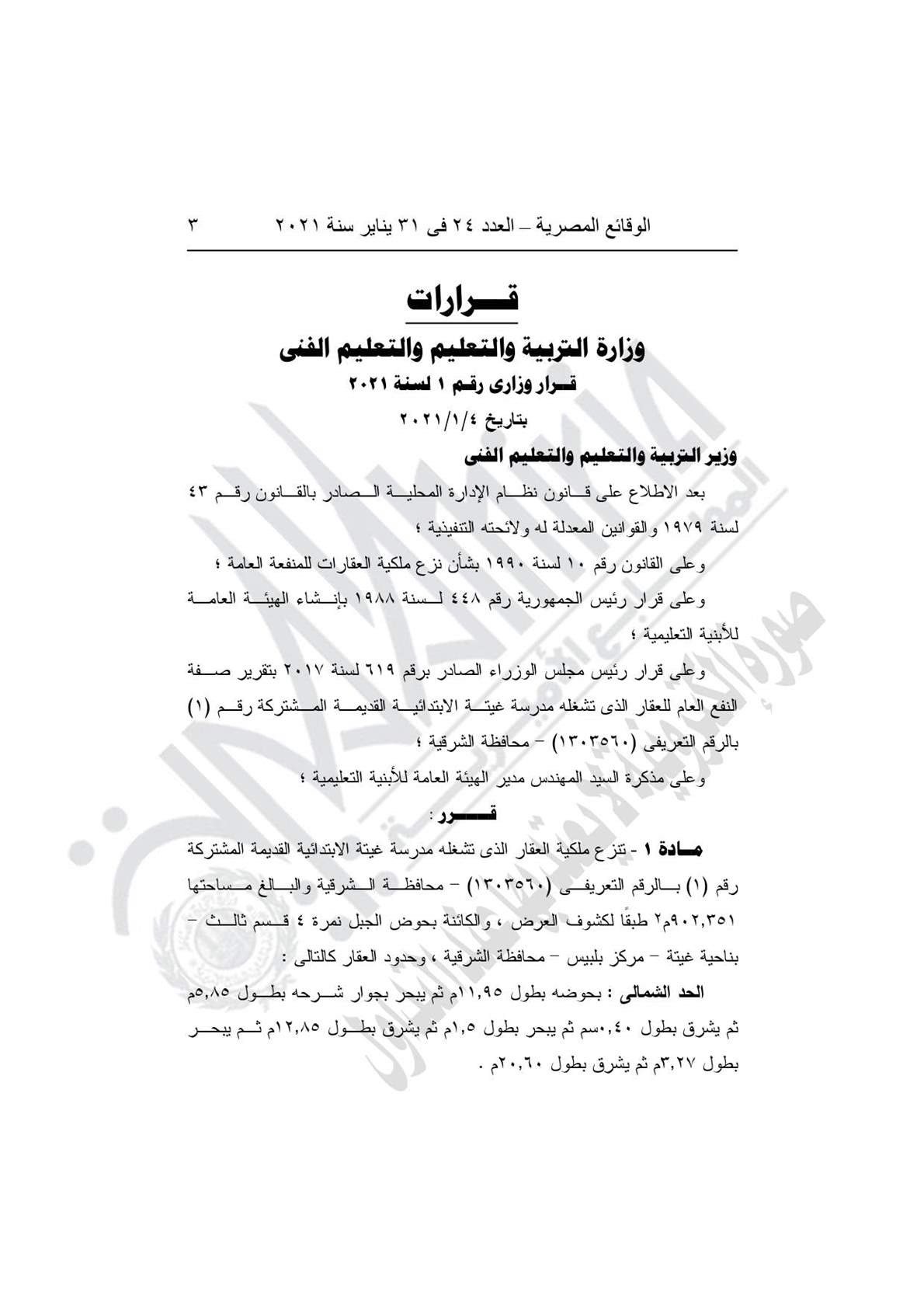 نشرت جريدة الوقائع المصرية في عددها رقم 24، الصادر اليوم 31 يناير 2021، قرار وزير التربية والتعليم والتعليم الفني رقم 1 لسنة 2021، بخصوص نزع ملكية العقار الذي تشغله مدرسة غيتة الابتدائية القديمة المشتركة رقم 1 بالرقم التعريفي 1303560 محافظة الشرقية والبالغ مساحتها 902.351 طبقا لكشوف العرض والكائنة بحوض الجبل نمرة 4 قسم ثالث بناحية غيتة .