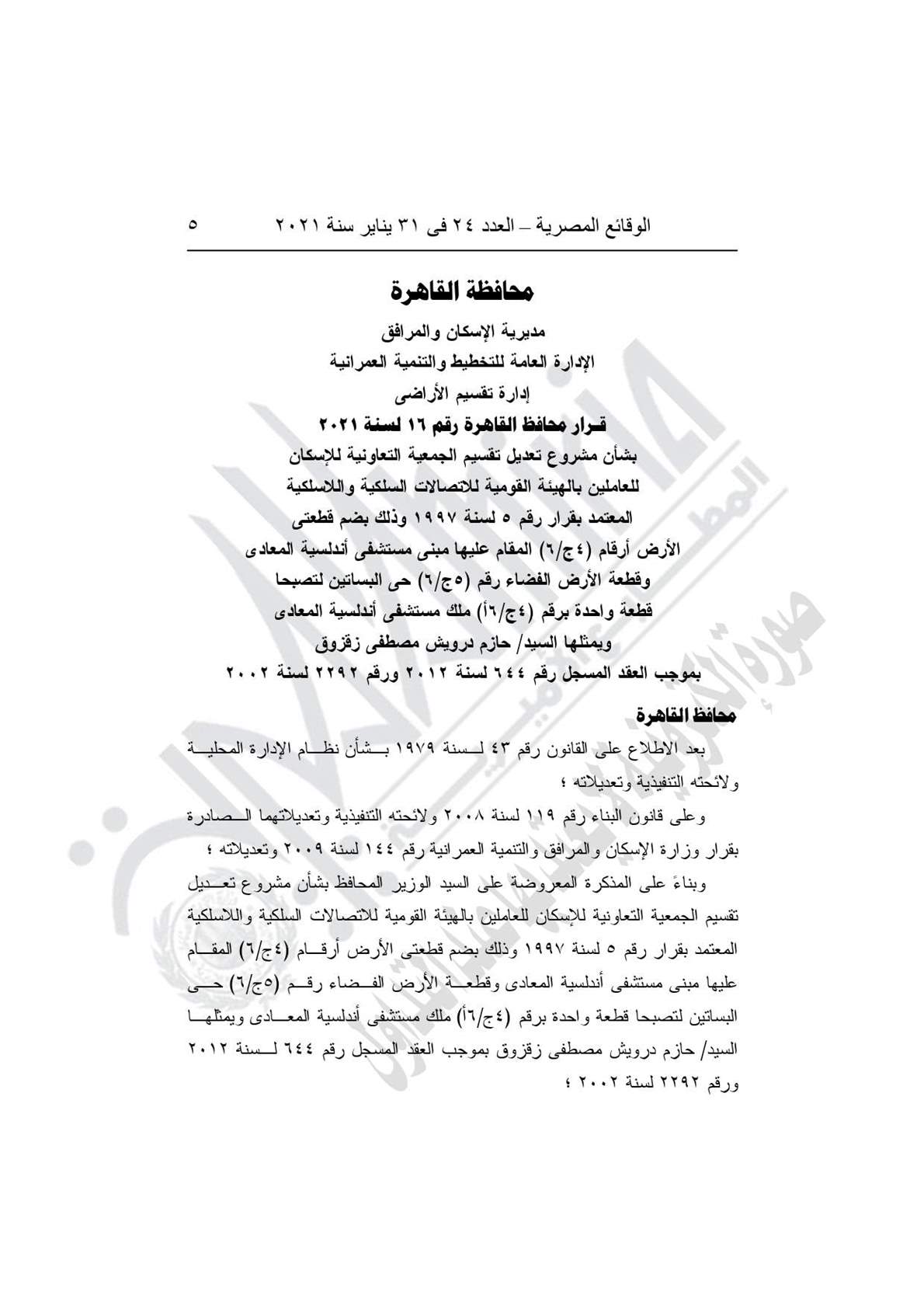 نشرت جريدة الوقائع المصرية في عددها رقم 24، الصادر اليوم 31 يناير 2021، قرار محافظ القاهرة رقم 16 لسنة 2021 بشأن مشروع تعديل تقسيم الجمعية التعاونية للإسكان للعاملين بالهيئة القومية للاتصالات السلكية واللاسلكية المعتمد بقرار رقم 5 لسنة 1997 وذلك بضم قطعتي الأرض أرقام ( 4 ج/6) حي البساتين لتصبحا قطعة واحدة برقم (5ج/ 6أ) ملك مستشفى أندلسية المعادي.