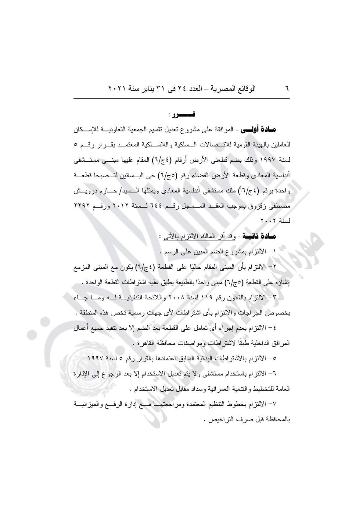 وتم الموافقة على مشروع تعديل تقسيم الجمعية التعاونية للإسكان للعاملين بالهيئة القومية للاتصالات السلكية واللاسلكية المعتمد بقرار رقم 5 لسنة 1997، والالتزام بأي اشتراطات لأي جهات رسمية تخص المنطقة وطبقا لما هو متبع بإجراءات الحي.