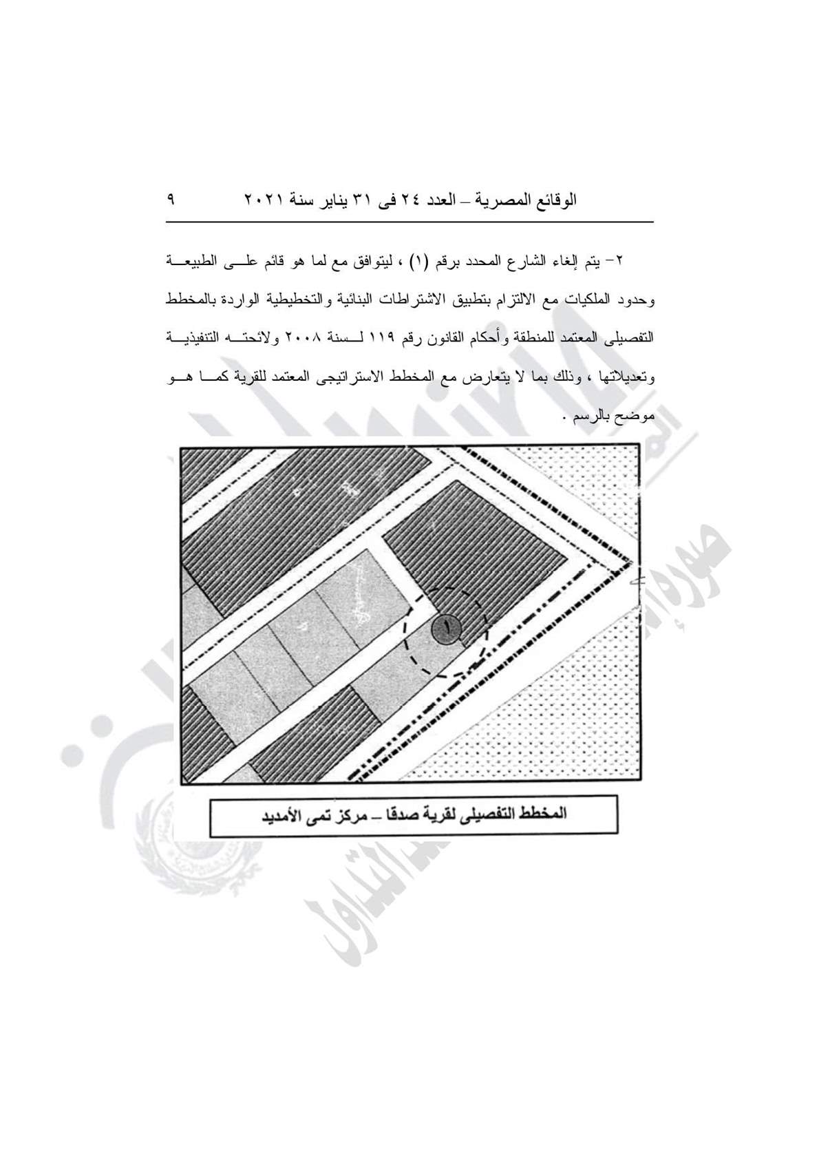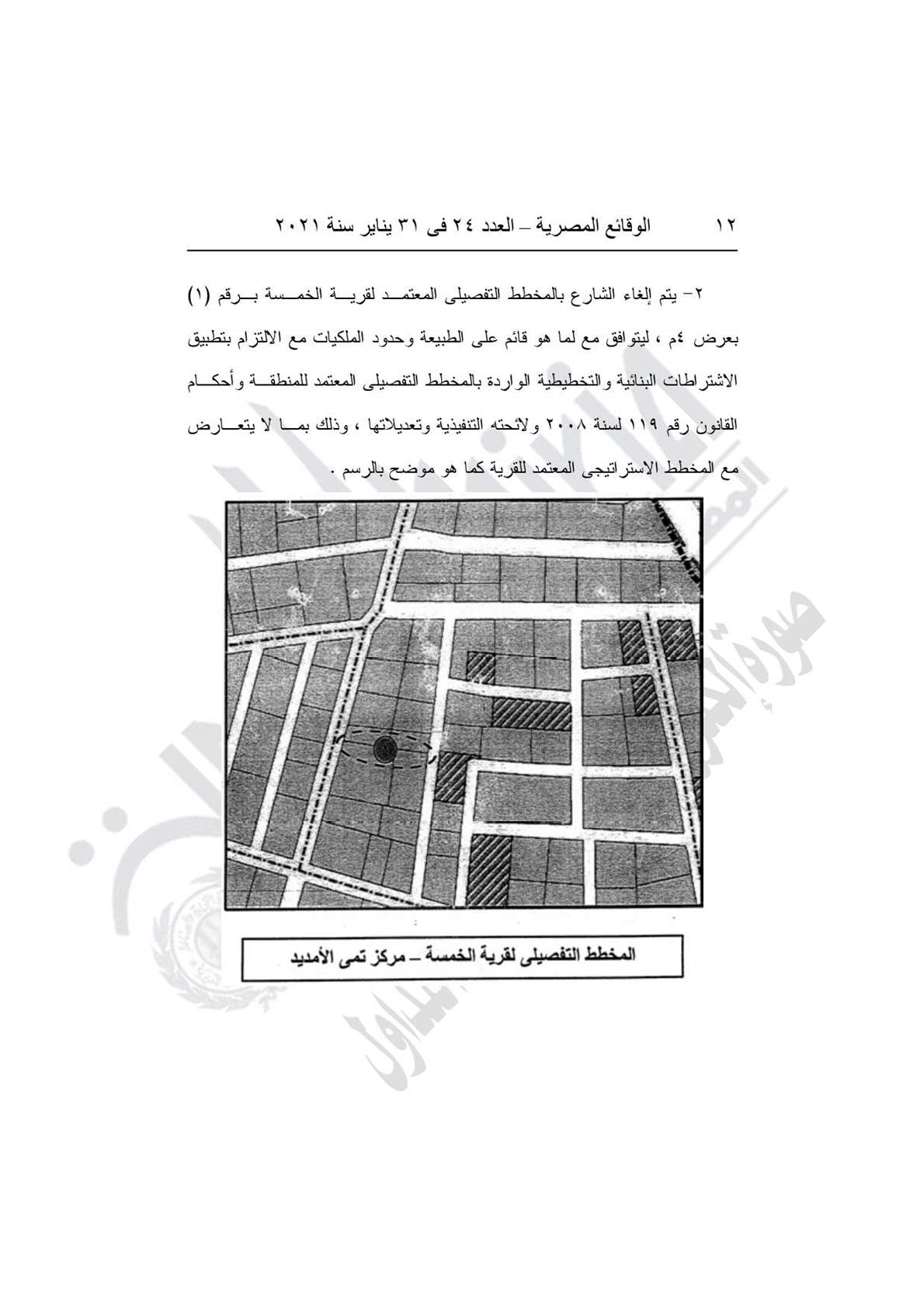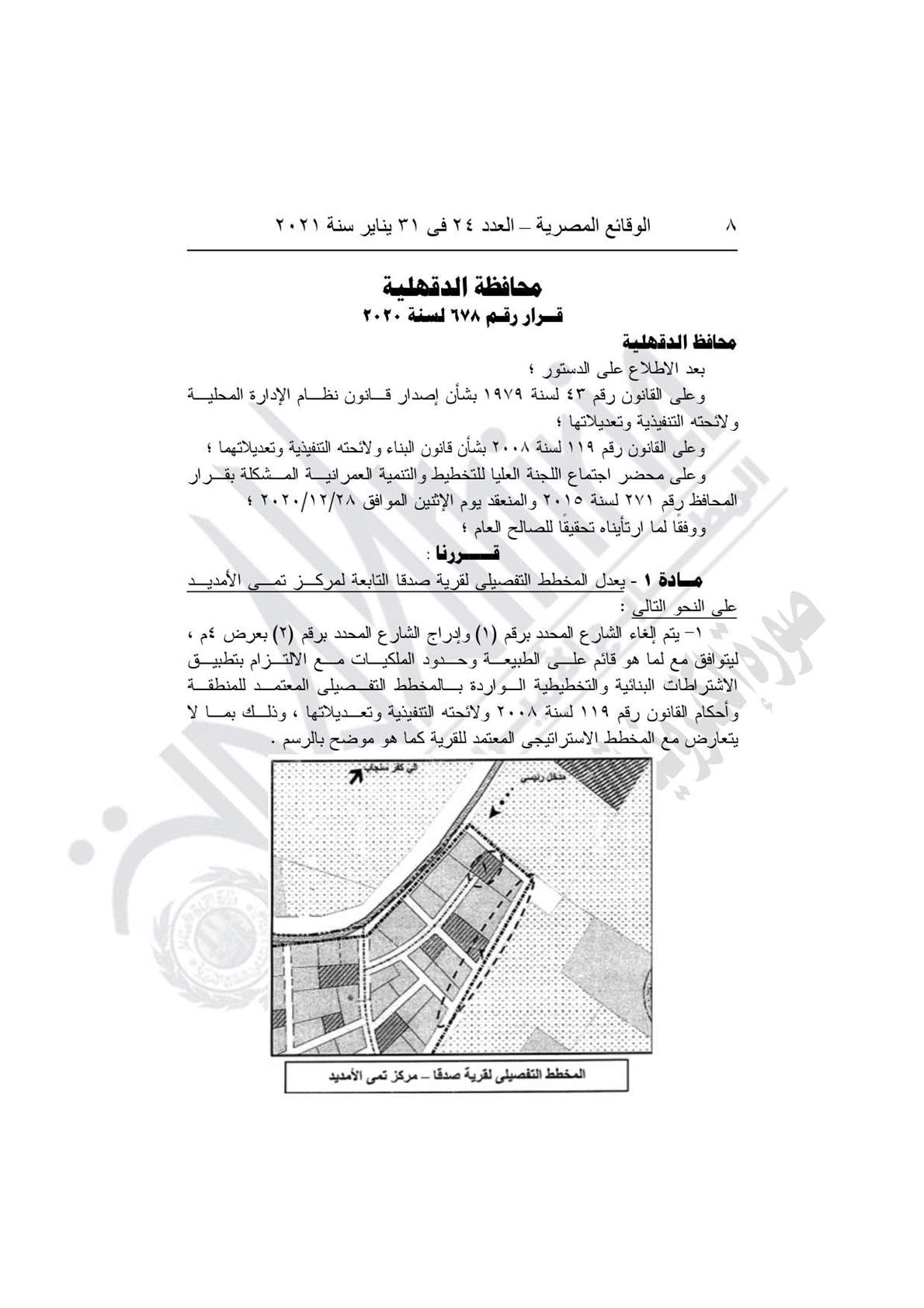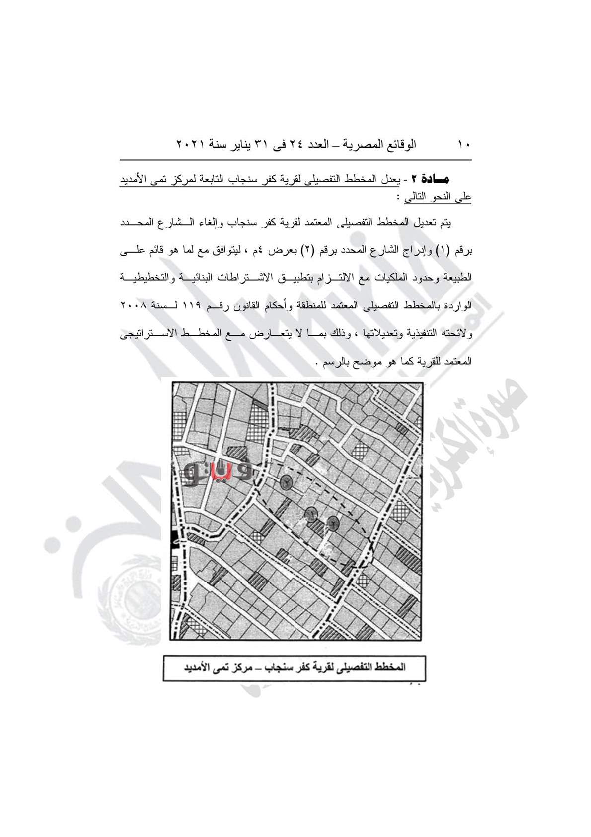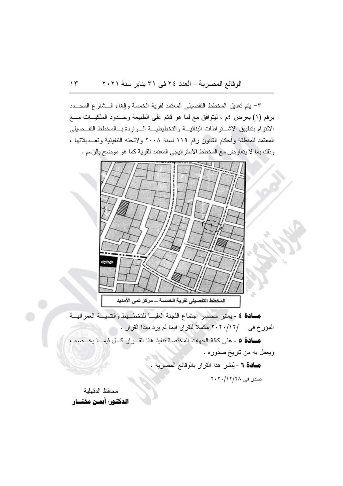 كما أصدر القرار بتعديل المخطط التفصيلي لقرية صدقا التابعة للمركز تمى الأمديد، كما يعدل المخطط التفصيلي لقرية كفر سنجاب التابعة لمركز تمي الأمديد، ويعدل المخطط التفصيلي لقرية الخمسة التابعة لمركز تمي الأمديد أيضا.