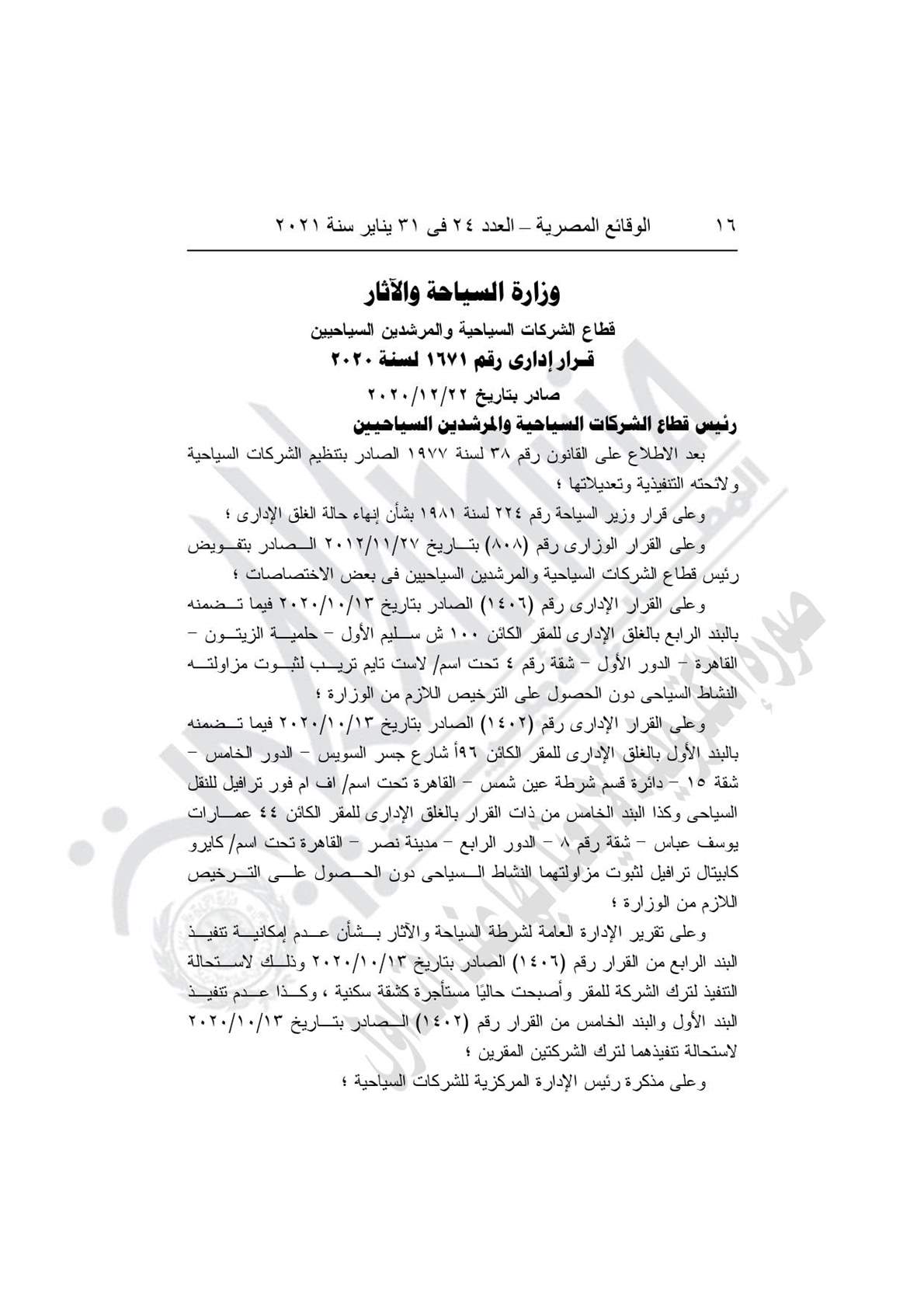 نشرت جريدة الوقائع المصرية في عددها رقم 24، الصادر في 31 يناير 2021، قرار رقم 1671 لسنة 2020 ل وزارة السياحة والأثار بشأن إنهاء حالة الغلق الإداري.