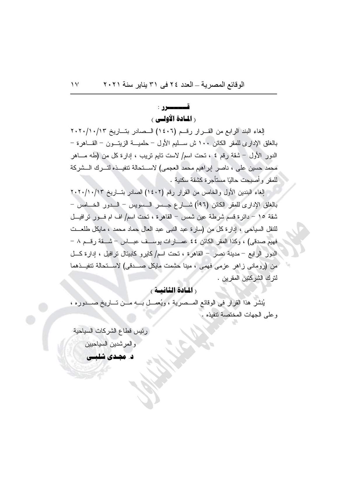 وصدر قرار بإلغاء البند الرابع من القرار رقم 1406 الصادر بتاريخ 13 /10 /2020 بالغلق الإداري للمقر الكائن 100 ش سليم الأول حلمية الزيتون القاهرة، لاستحالة تنفيذه لترك الشركة للمقر وأصبحت حاليا مستاجرة كشقة سكنية.