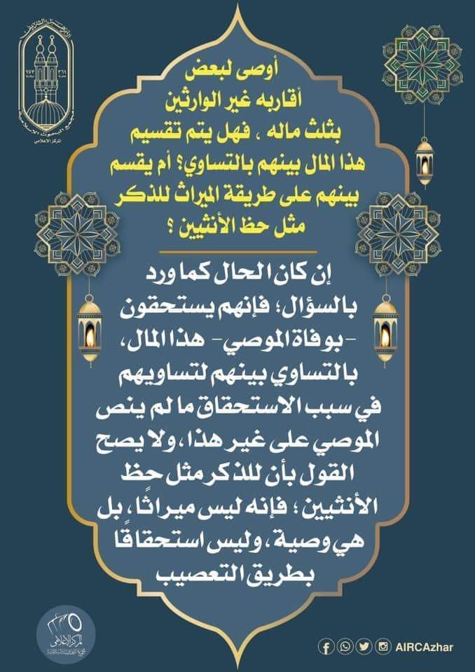 ورد سؤال إلى لجنة الفتوى بمجمع البحوث الإسلامية بالأزهر الشريف يقول فيه صاحبه: أوصى لبعض أقاربه غير الوارثين بثلث ماله، فهل يتم تقسيم هذا المال بينهم بالتساوي؟ أم يقسم بينهم على طريقة الميراث للذكر مثل حظ الأنثيين؟، وجاء رد اللجنة كالتالي: