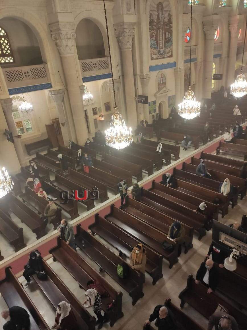 وحرص أقباط الكنيسة المرقسية على الالتزام بارتداء الكمامات الطبية والحفاظ على التباعد الاجتماعي بينهم خلال تأدية صلاة القداس بداخل الكنيسة.