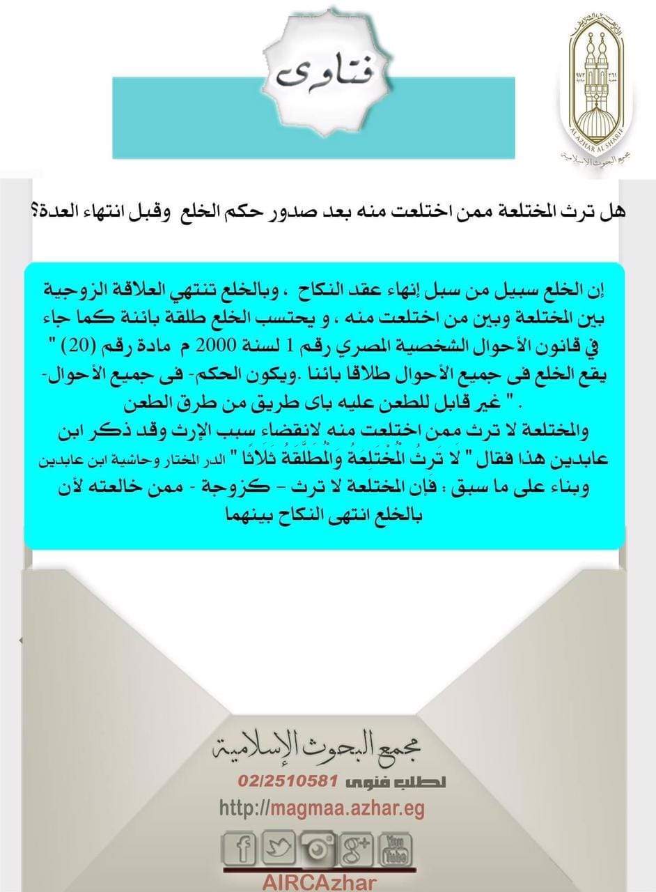 ورد سؤال إلى لجنة الفتوى بمجمع البحوث الإسلامية بالأزهر الشريف يقول فيه صاحبه "هل ترث المختلعة ممن اختلعت منه بعد صدور حكم الخلع وقبل انتهاء العدة؟"، وجاء رد اللجنة كالتالي: