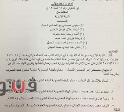 وكان تقرير الإتهام شمل كلًا من المحامون جيهان مصطفى أبو المحاسن وشيماء جلال النحاس وأحمد يوسف محمود ورضا هريدي أحمد وأشرف محمد رفعت، ومدير عام الإدارة القانونية نادي عبد الهادي محمد.