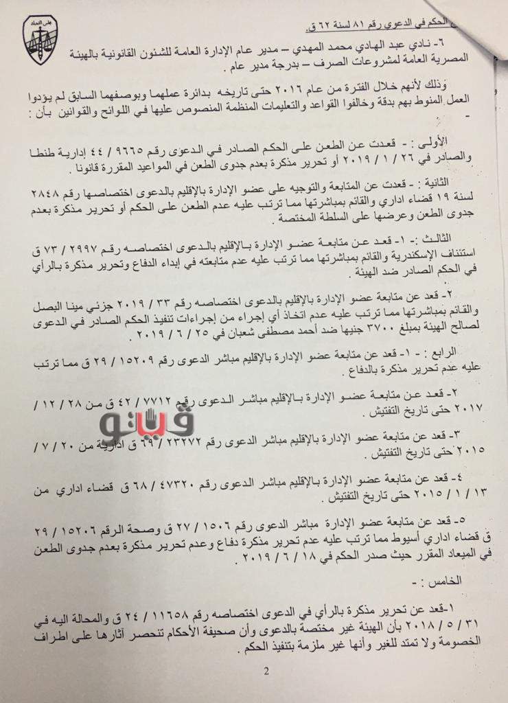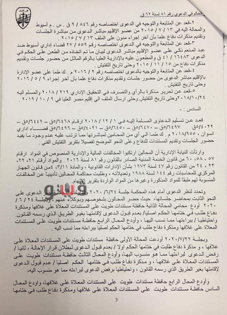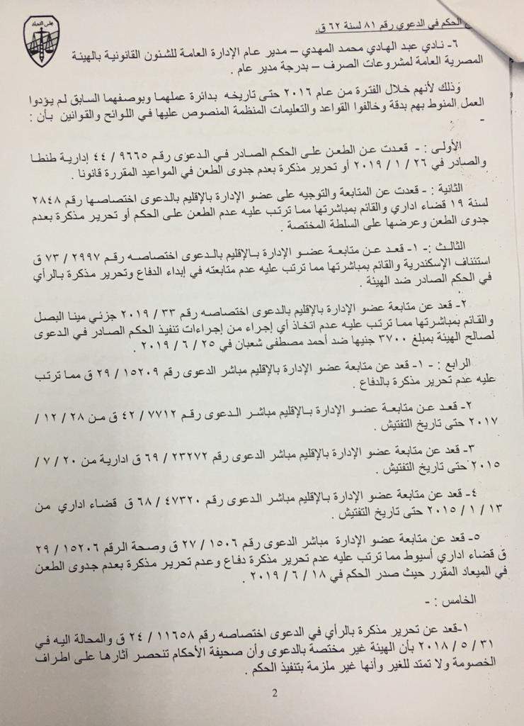 وتبين من تقرير الإتهام أن المحالين من الأول حتى الخامس تقاعسوا عن الطعن على بعض الأحكام الصادرة ولم يحرروا مذكرات بالراي وعدم جدوى الطعن في المواعيد المقررة قانونًا، ولم يتابعوا عضو الإدارة بالإقليم.