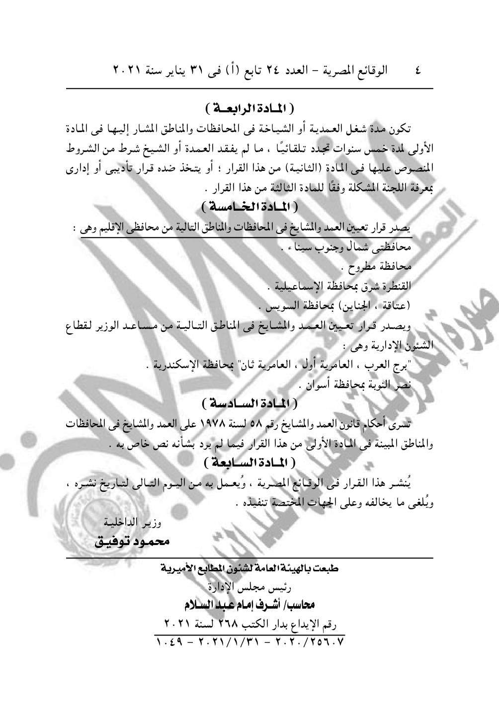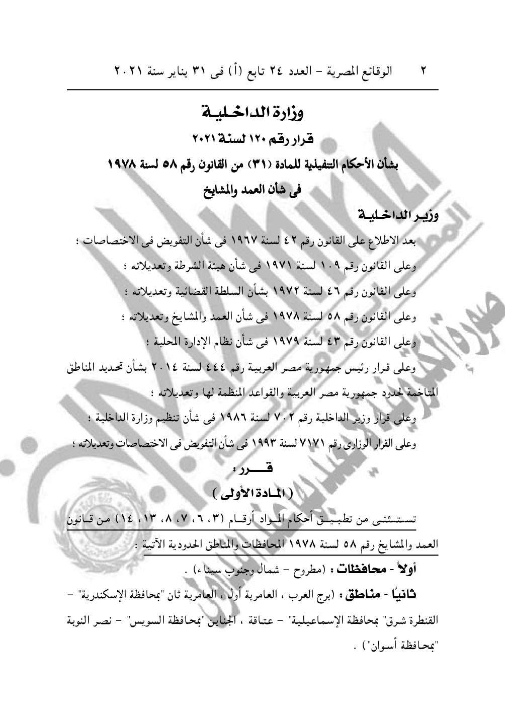 نشرت جريدة الوقائع المصرية في عددها رقم 24 تابع (أ)، الصادر اليوم 31 يناير 2021، قرار وزارة الداخلية رقم 120 لسنة 2021 بشأن الأحكام التنفيذية للمادة (31) من القانون رقم 58 لسنة 1978 في شأن العمد والمشايخ.