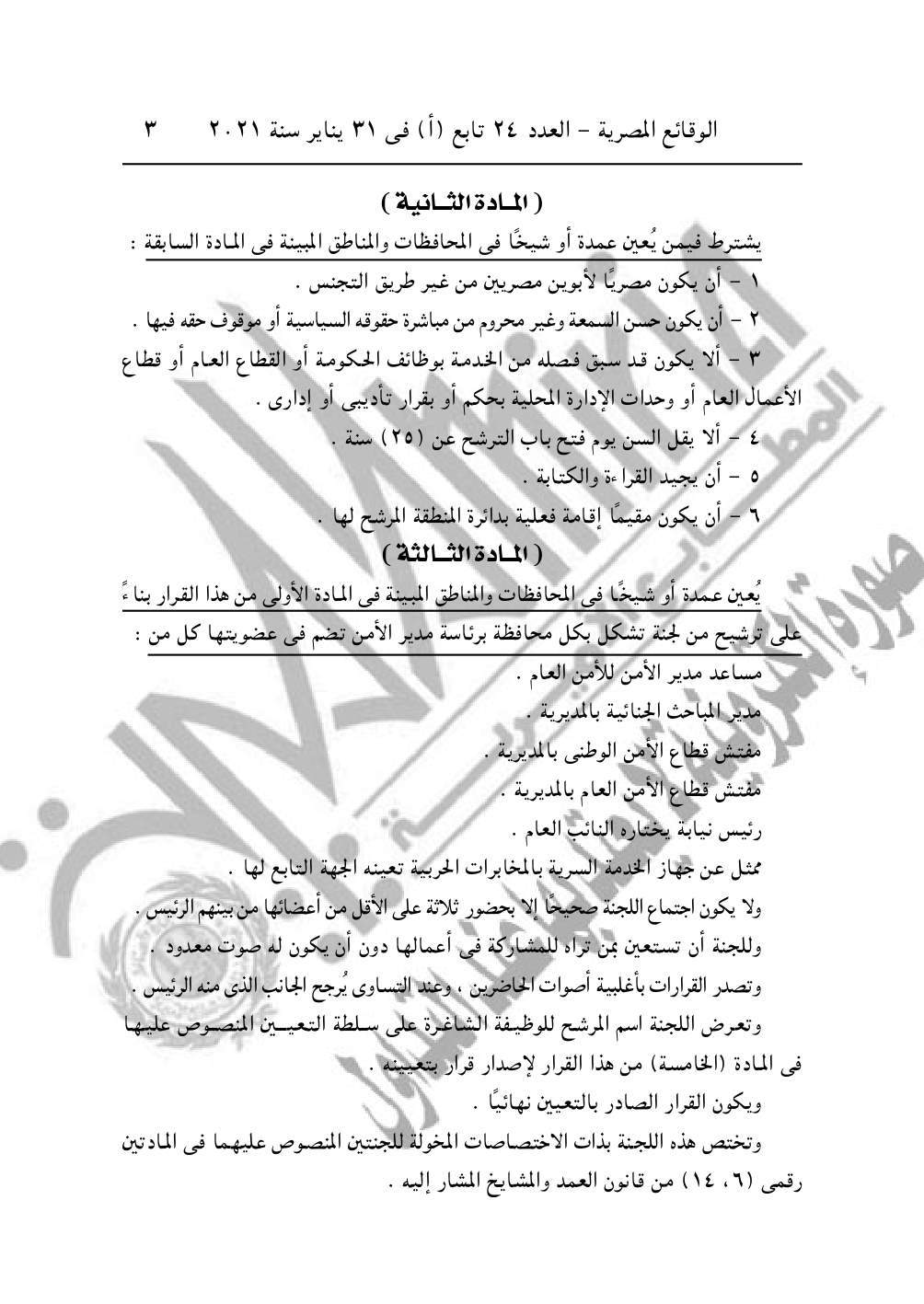 كما حددت الجريدة الرسمية شروط الذين يتقدموا للتعيين كعمدة أو شيخ في المحافظات والمناطق المبينة في المواد.