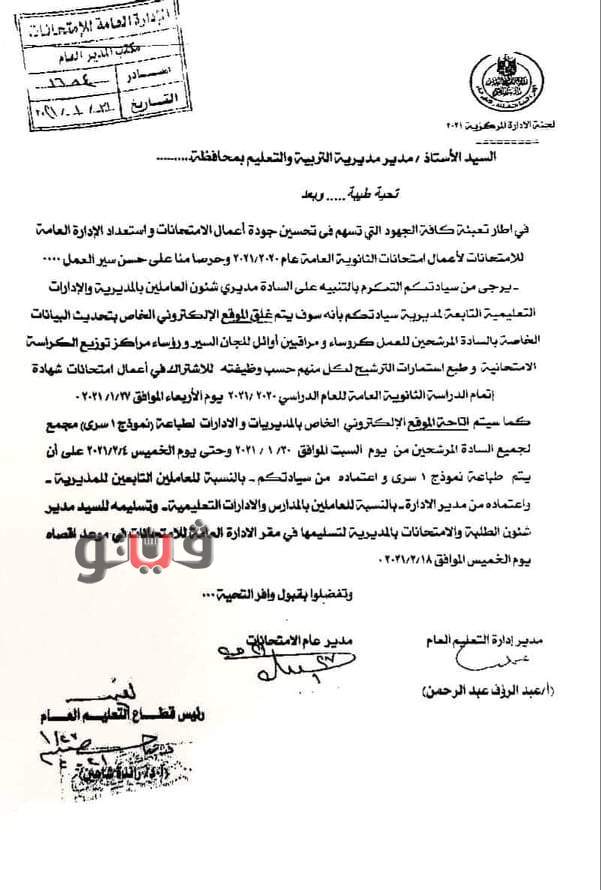 ومن المقرر أن يتم طباعة نموذج واحد ١ سري واعتماده من مدير المديرية بالنسبة للعاملين التابعين المديرية أو اعتماده من مدير الادارة بالنسبة للعاملين المدارس والإدارات التعليمية وتسليمه لمدير شؤون الطلبة والإمتحانات في المديرية لتسليمها في مقر الإدارة العامة للامتحانات في موعد أقصاه الخميس الموافق 18 فبراير 2021.