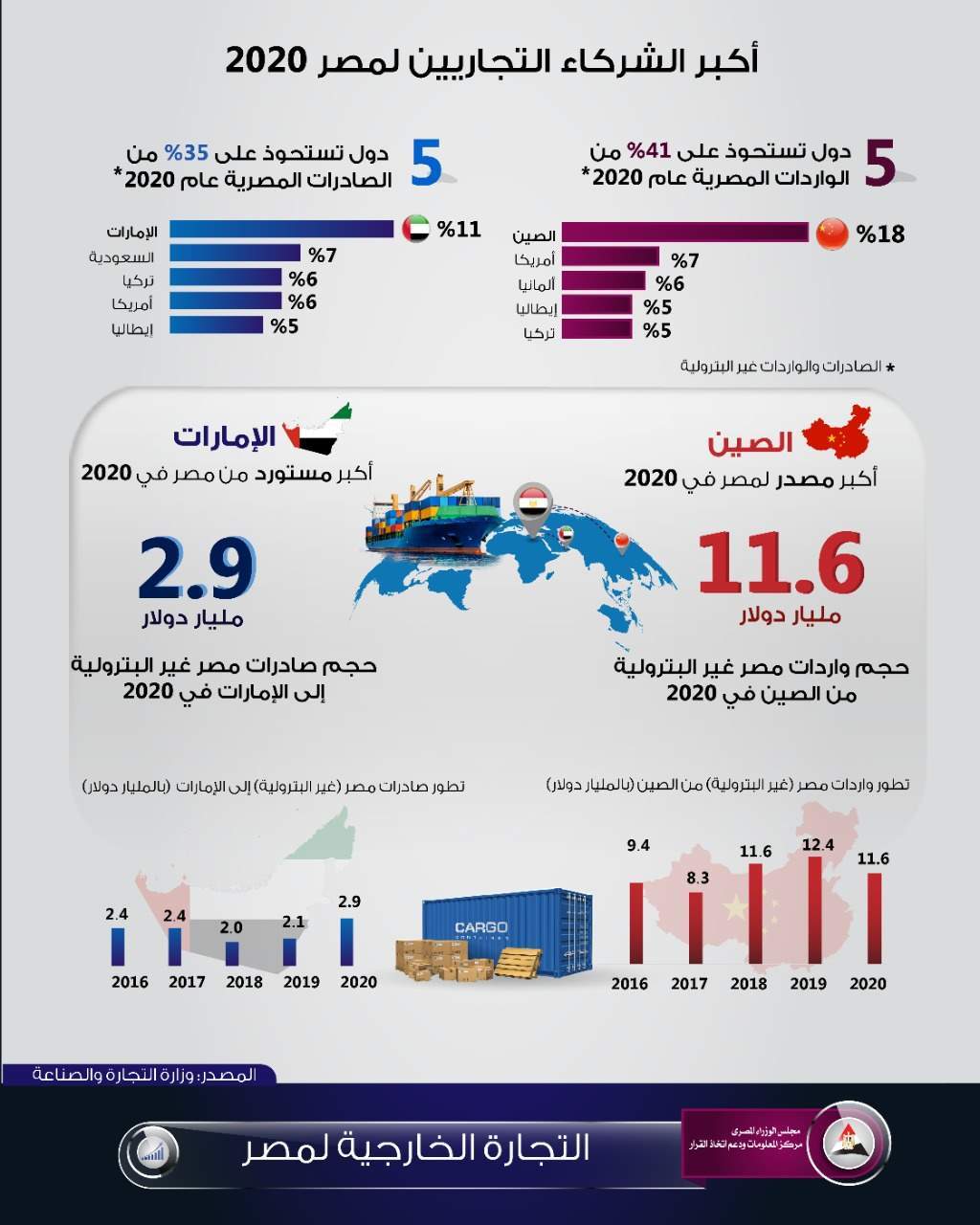 نشر مركز المعلومات ودعم اتخاذ القرار التابع لمجلس الوزراء، إنفوجرافيك بعنوان "أكبر الشركاء التجاريين لمصر 2020" يتضمن التعريف بأكبر 5 شركاء تجاريين لمصر في الصادرات والواردات غير البترولية، بالاعتماد على أحدث بيانات صادرة عن وزارة التجارة والصناعة المصرية.