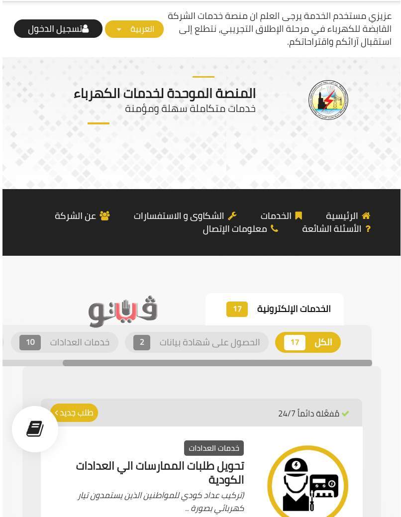 أولا: يمكنك الدخول على موقع المنصة الموحدة لخدمات الكهرباء عبر الرابط الآتي اضغط هنا