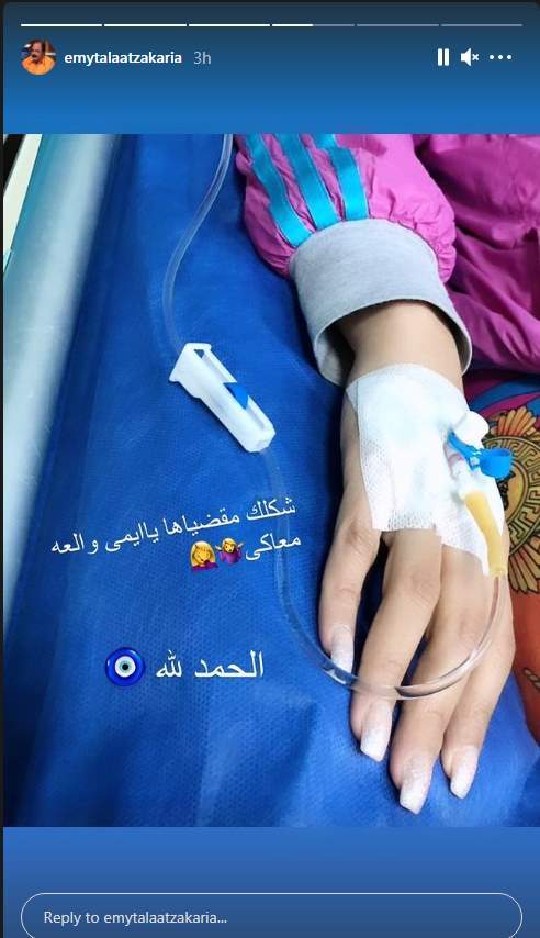 ونشرت إيمي صورة لها من داخل المستشفى معلقة في يدها محاليل، حيث كتبت عليها قائلة: "شكلك مقضياها يا إيمي والعة معاك.. الحمد لله".