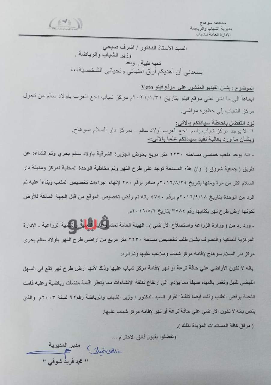 وأكد مسئولو وزارة الشباب والرياضة في خطاب رسمي حصلت «فيتو» على صورة منه أنه لا يوجد مركز شباب يسمى نجع العرب بقرية أولاد سالم بمحافظة سوهاج.