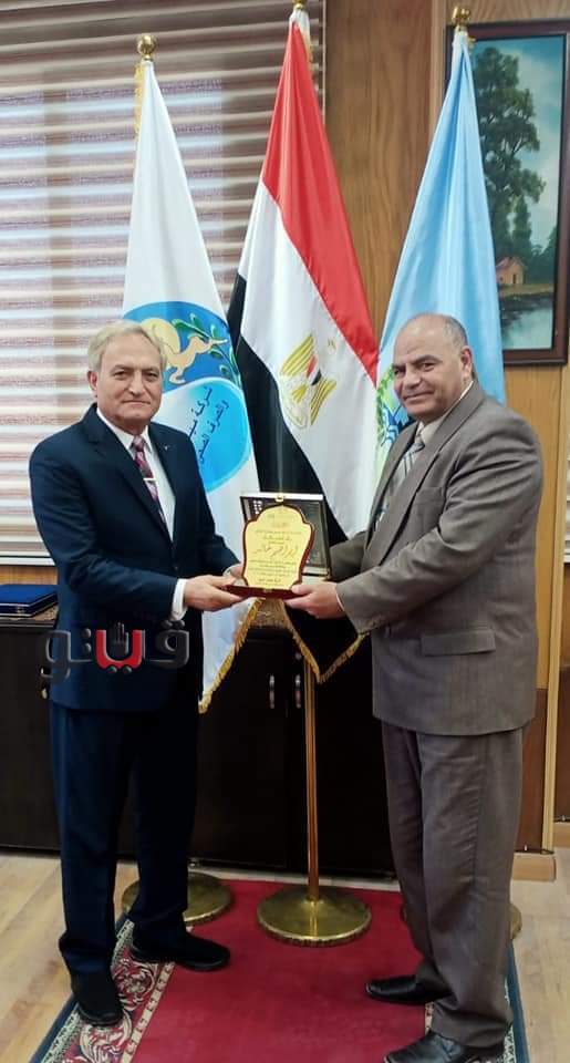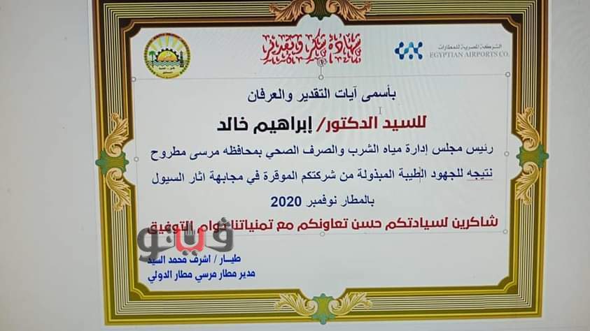 وسلم الطيار أشرف محمد، مدير مطار مطروح الدولي، درع وشهادة تقدير للدكتور إبراهيم خالد، العضو المنتدب ورئيس مجلس إدارة شركة مياه الشرب والصرف الصحي بمحافظة مطروح، تعبيراً عن الشكر والتقدير على المساندة والتعاون الفعال أثناء مجابهة المطار للسؤول.