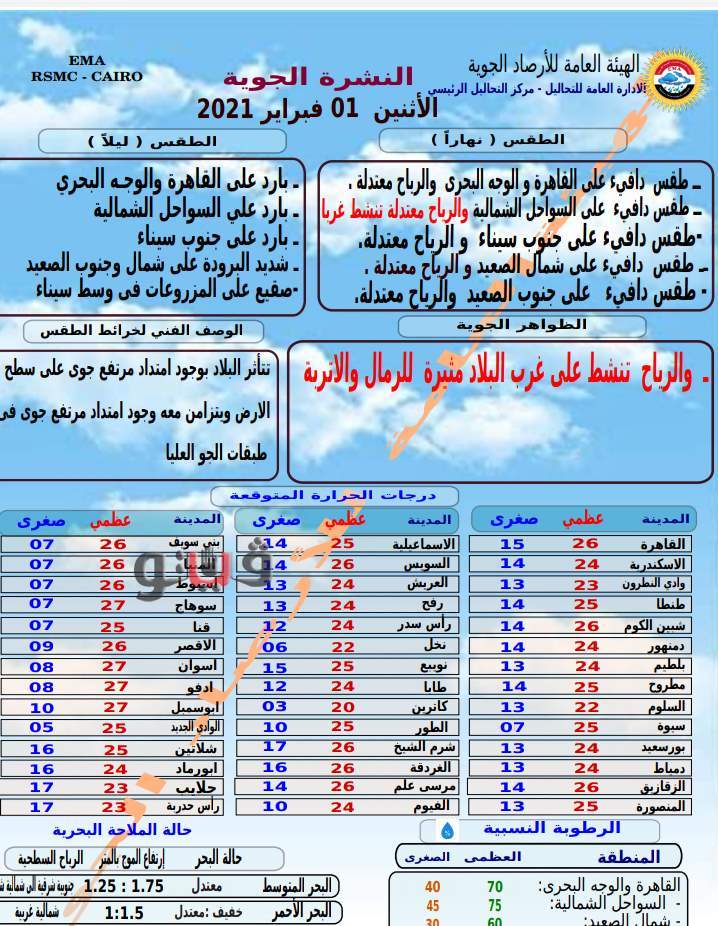 ومن المتوقع أن تنشط الرياح المثيرة للرمال والأتربة على غرب البلاد ، ومعتدلة على باقى الأنحاء.
