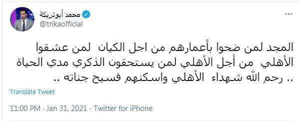 وكتب محمد أبو تريكة قائلًا: "المجد لمن ضحوا بأعمارهم من أجل الكيان.. لمن عشقوا الأهلي من أجل الأهلي.. لمن يستحقون الذكرى مدى الحياة.. رحم الله شهداء الأهلي وأسكنهم فسيح جناته".