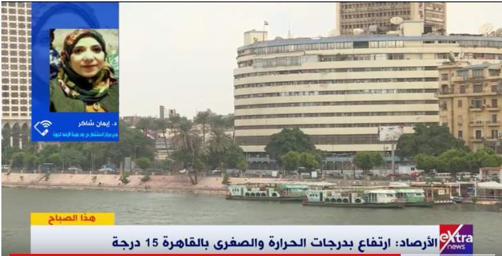وقالت إيمان شاكر وكيل مركز الاستشعار عن بعد بهيئة الأرصاد الجوية، في مداخلة هاتفية لها في برنامج "هذا الصباح" المذاع على فضائية "إكسترا نيوز": إن درجات الحرارة خلال الساعات المقبلة، متقلبة، حيث ترتفع درجات الحرارة أعلى من معدلها الطبيعي بحوالي أربع درجات، وستسجل الصغرى في القاهرة 15 درجة مئوية.