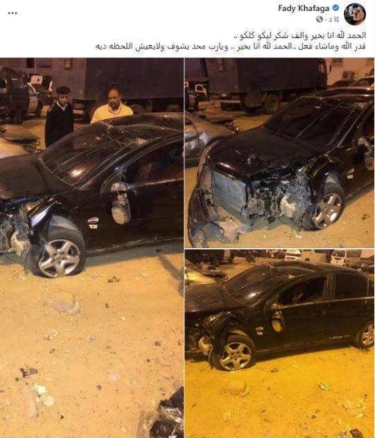 ثم طمئن جمهورها ونشر فادي صورًا لسيارته، عبر حسابه الشخصي على موقع التواصل الإجتماعي "فيس بوك"، وعلق: "الحمد لله.. أنا بخير، وألف شكر ليكم كلكم.. قدر الله وما شاء فعل ..الحمد لله أنا بخير .. ويا رب ما حد يشوف ولا يعيش اللحظة دي".