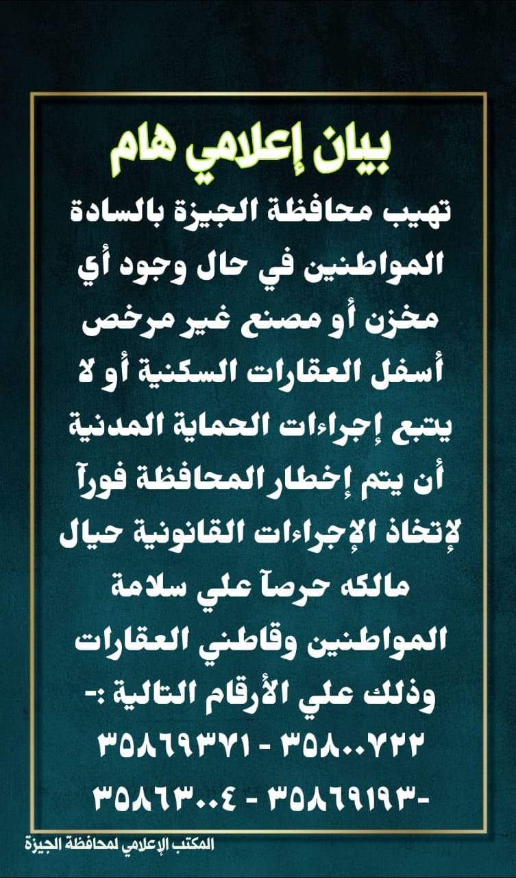 أهابت محافظة الجيزة بكافة المواطنين بضرورة الإبلاغ عن أى وجود أي مخزن أو مصنع غير مرخص اسفل العقارات السكنية، وذلك بعد أزمة عقار فيصل المشتعل.