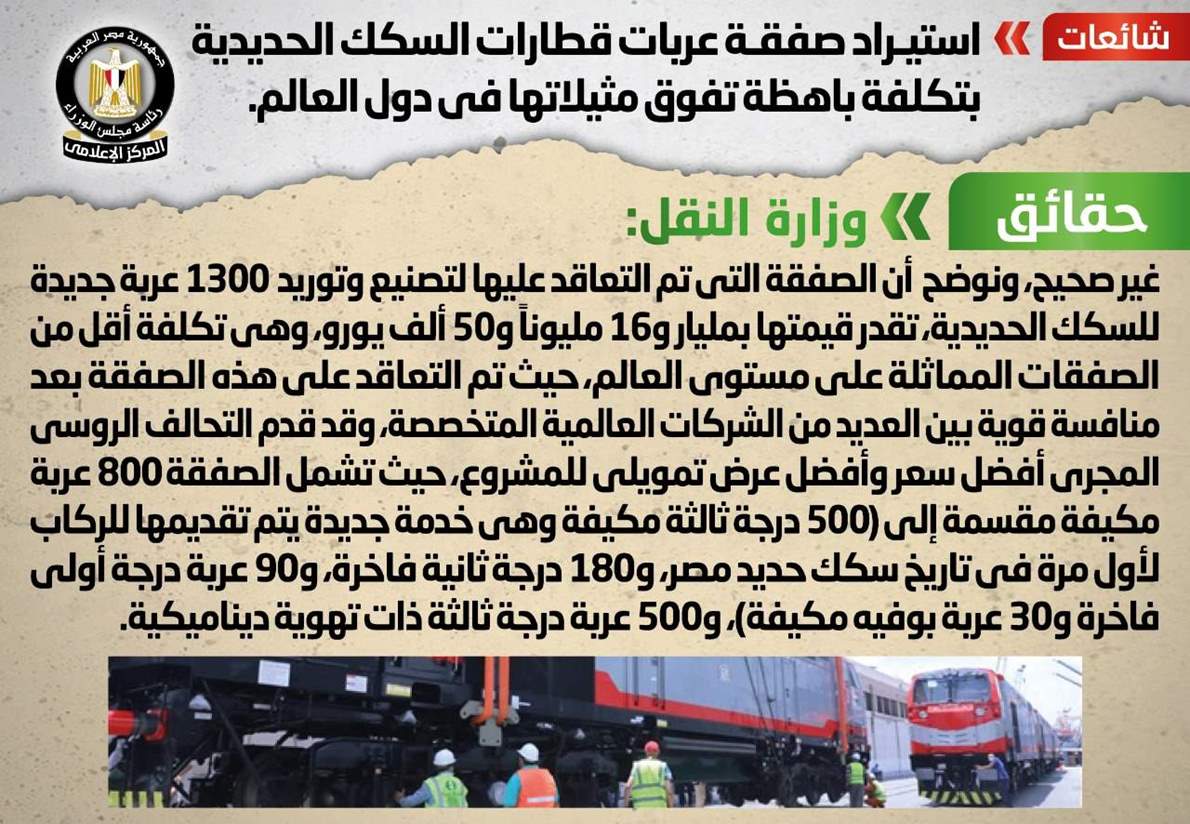 وتواصل المركز الإعلامي لمجلس الوزراء مع وزارة النقل، والتي نفت تلك الأنباء، مُؤكدةً أنه لا صحة لاستيراد صفقة عربات قطارات السكك الحديدية بتكلفة باهظة تفوق مثيلاتها في دول العالم.