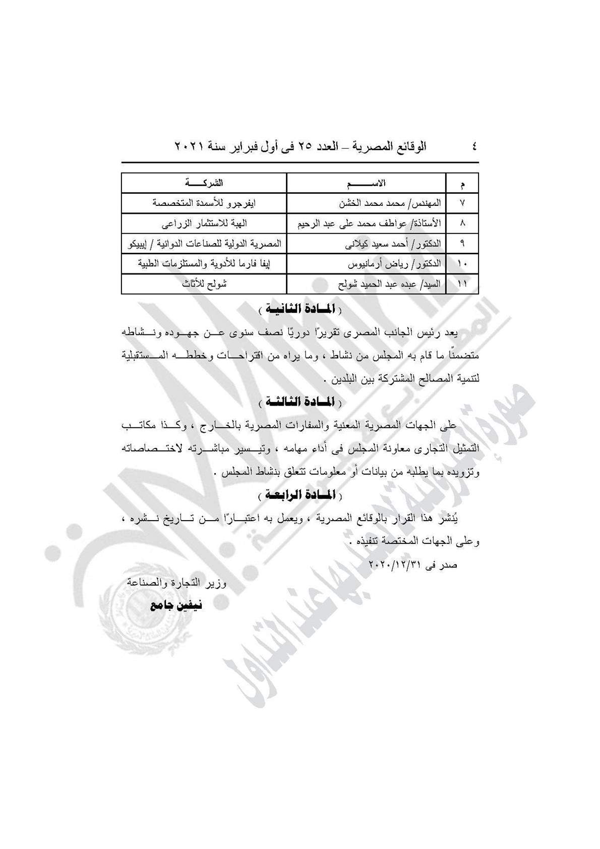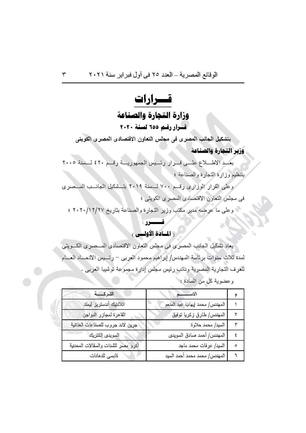 نشرت جريدة الوقائع المصرية في عددها رقم 25، الصادر في أول فبراير 2021، قرار وزارة التجارة والصناعة رقم 655 لسنة 2020، بشأن تشكيل الجانب المصري في مجلس التعاون الاقتصادي المصري الكويتي.