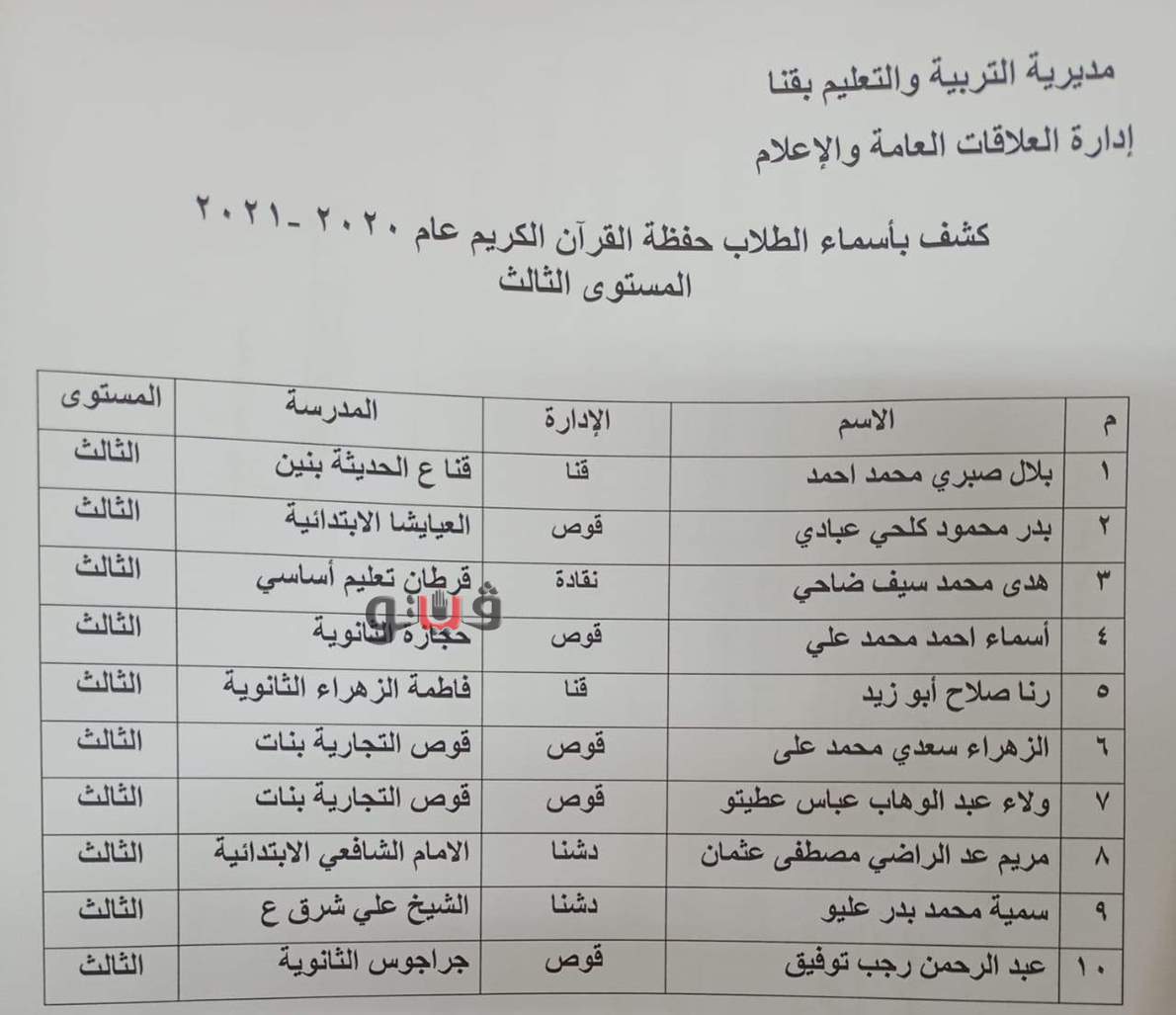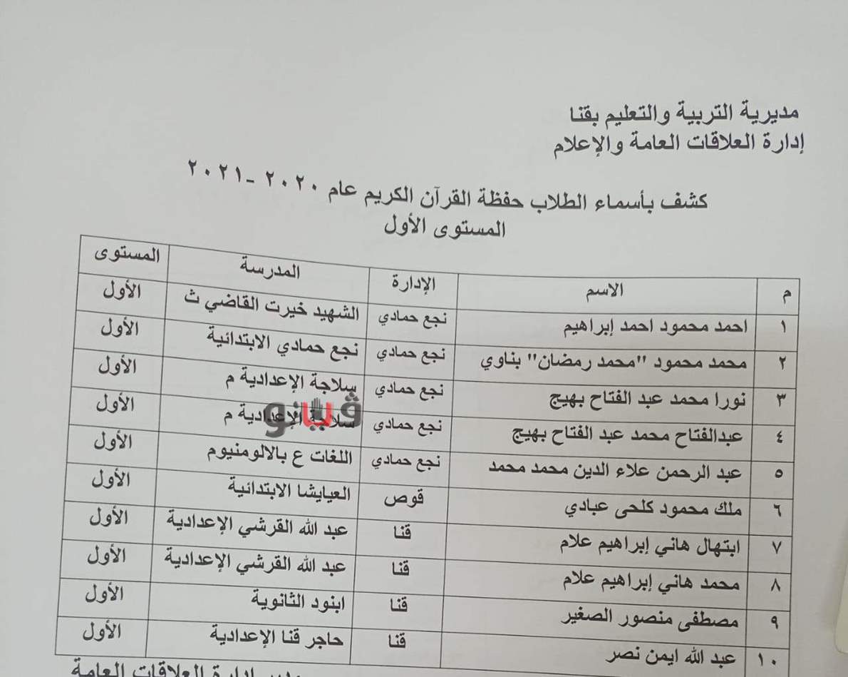 أعلن مدير تعليم قنا فوز 10 طلاب من كل مستوى من مستويات المسابقة الثلاثة ،الأول حفظ القرآن الكريم كاملاً والثاني حفظ نصف القرآن الكريم والثالث حفظ ربع القرآن الكريم .