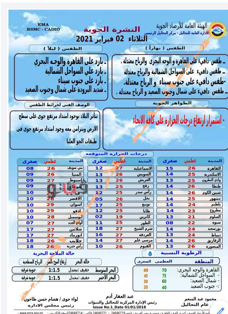 حالة الطقس ودرجات الحرارة المتوقعة اليوم الثلاثاء 2-2-2021 في مصر