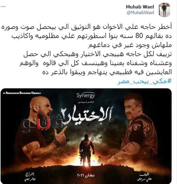 وأضاف مهاب: "أخطر حاجة على الإخوان هو التوثيق الذي يحدث بالصوت والصورة، هما بقالهم 80 سنة وبنوا أسطورتهم على مظلومية وأكاذيب لا وجود لها إلا في عقولهم، تزييف لكل حاجة هييجي الاختيار وهيحكي كل اللي حصل وعشناه وشفناه بعنينا وهينسف كل اللي قالوه والوهم اللي عايشين فيه فطبيعي يتهاجم ويبقوا بالذعر ده".