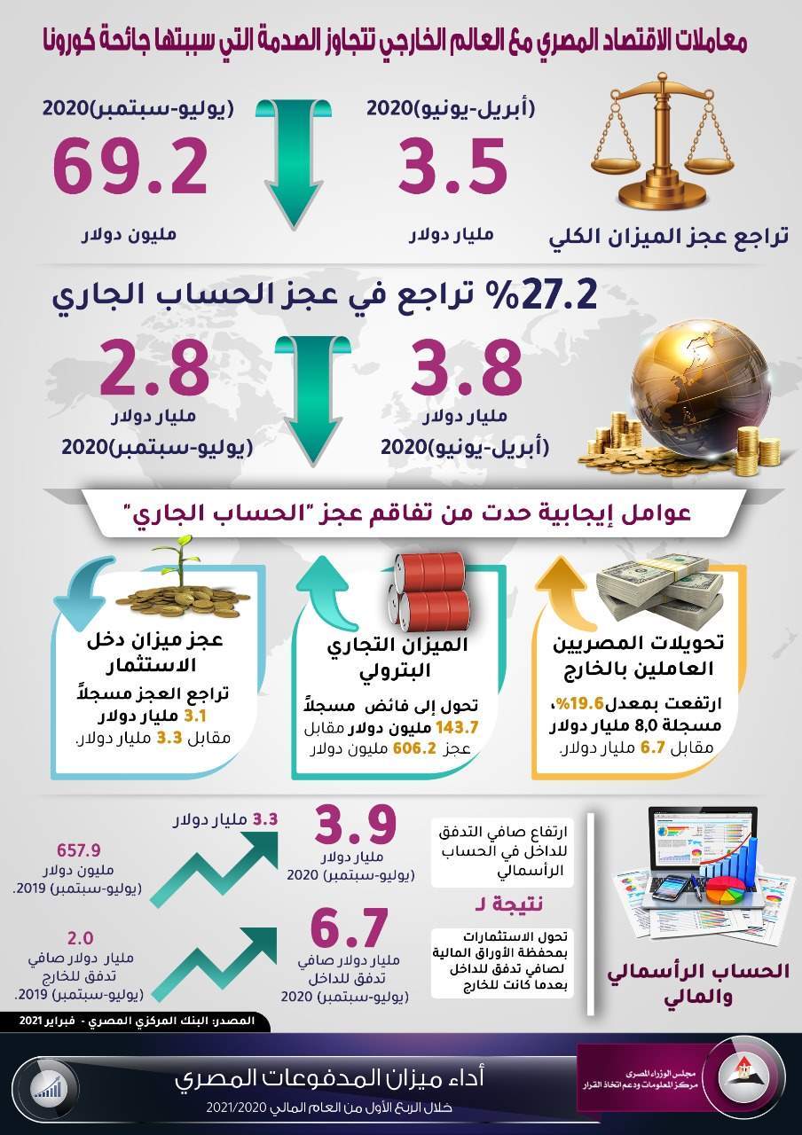نشر مركز المعلومات ودعم اتخاذ القرار برئاسة مجلس الوزراء المصري إنفوجرافيك بعنوان "معاملات الاقتصاد المصري مع العالم الخارجي تتجاوز الصدمة التي سببتها جائحة كورونا"، متناولاً أداء ميزان المدفوعات المصري خلال الربع الأول من العام المالي 2020/2021.