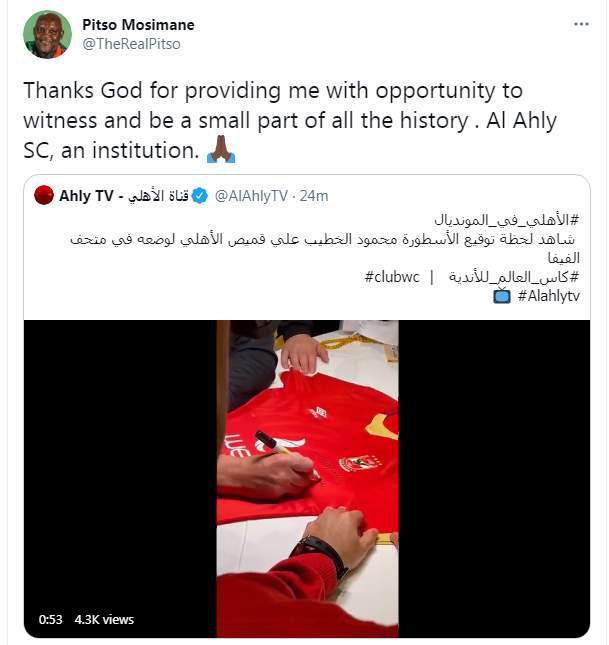 وكتب بيتسو موسيماني تغريدة على تويتر: "الحمد لله على إتاحة الفرصة لي لأكون جزءًا صغيرًا من كل التاريخ.. الأهلي مؤسسة".