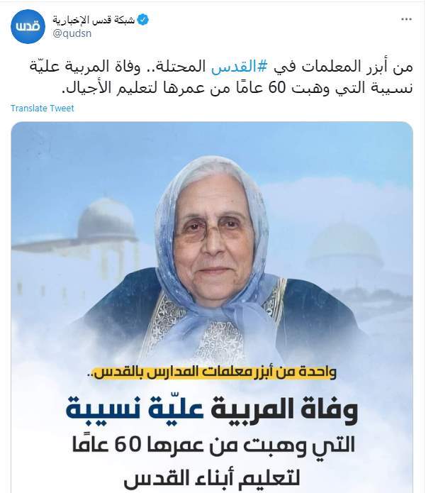 وفاة عليّة نسيبة، خبر جاء على استحياء في عدد من مواقع التواصل الاجتماعي، وبعض المواقع الفلسطينية، فالعالم عرف علية نسيبة بالمربية المقدسيّة، التي سخّرت 60 عاماً من عمرها في التعليم وتنشئة طالباتٍ لا يخضع تعليمهن لمناهج الاحتلال الإسرائيلي، وفي سبيل الخروج من عباءة التهودي أسست مدرسة من أعرق مدارس القدس.
