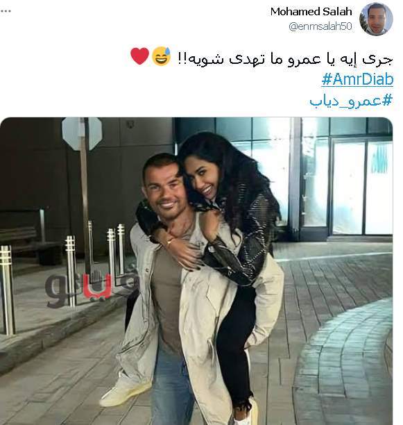 وعلق محمد صلاح، على صورة الفنان عمرو دياب والإعلامية إنجي كيوان قائلا: "جرى إيه يا عمرو ما تهدى شويه".