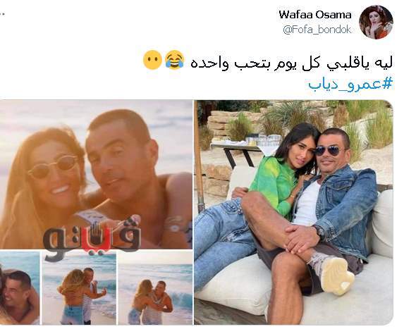 ونشرت وفاء أسامة صورة عمرو دياب مع دينا الشربيني، وإنجي كيوان معلقة عليها: ليه يا قلبي كل يوم بتحب واحده؟